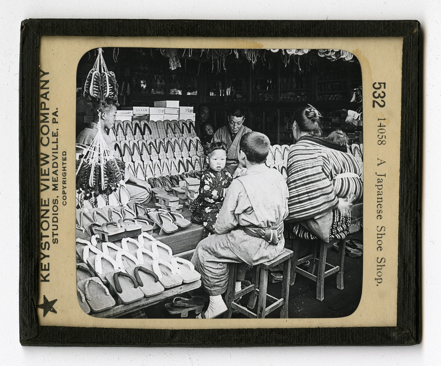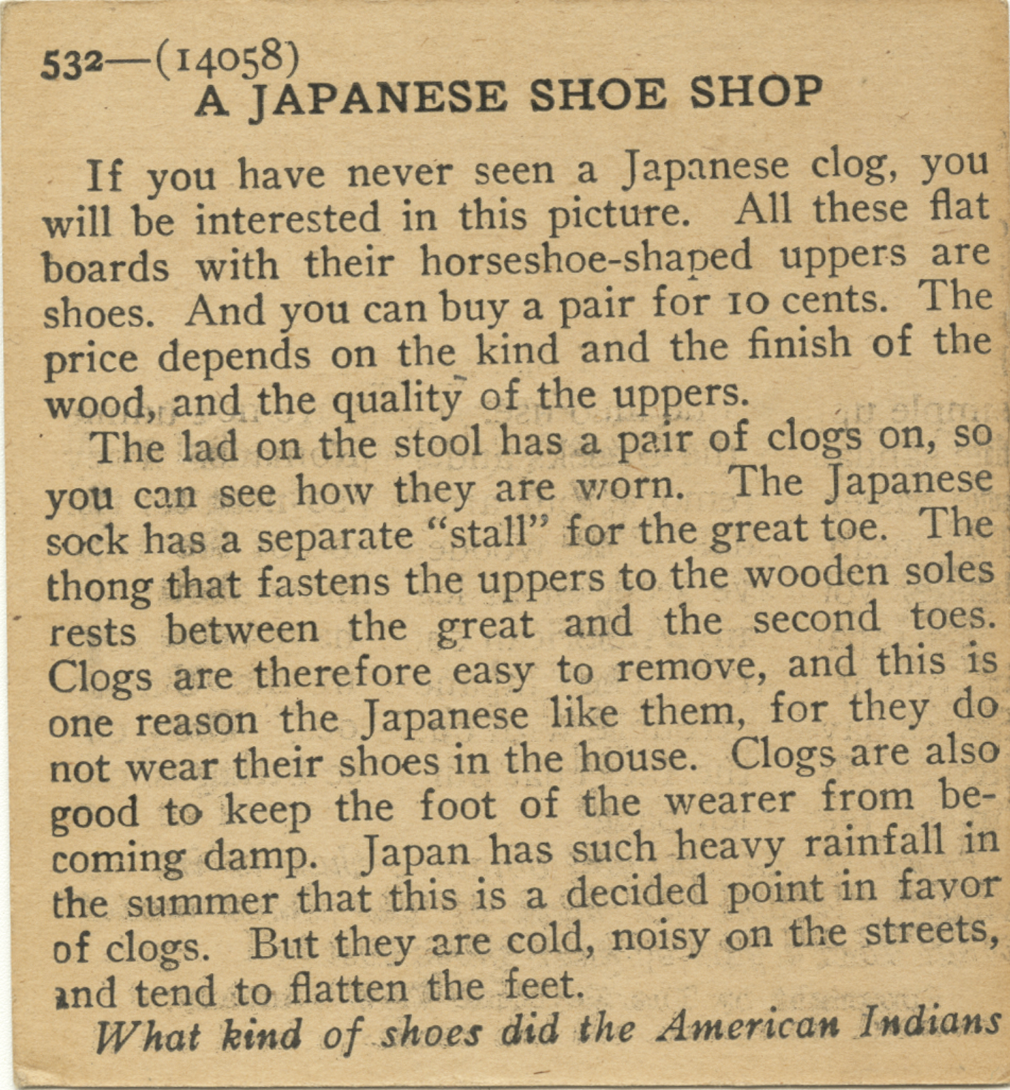If you whave never seen a Japanese clog, you will be interested in this picture. All these flat boards with their horseshoe-shaped uppers are shoes. And you can buy a pair for 10 cents. The price depends on the kind and the finish of the wood, and the quality of the uppers. The lad on the stool has a pair of clogs on, so you can see how they are worn. The Japanese sock has a separate "stall" for the great toe. The thong that fastens the uppers to the wooden soles rests between the great and the second toes. Clogs are therefore easy to remove, and this is one reason the Japanese like them, for they do not wear their shoes in the house. Clogs are also good to keep the foor of the wearer from becoming damp. Japan has such heavy rainfall in the summer that this is a decided point in favor of clogs. But they are cold, noisy on the streets, and tend to flatten the feet. What kind of shoes did the American Indians