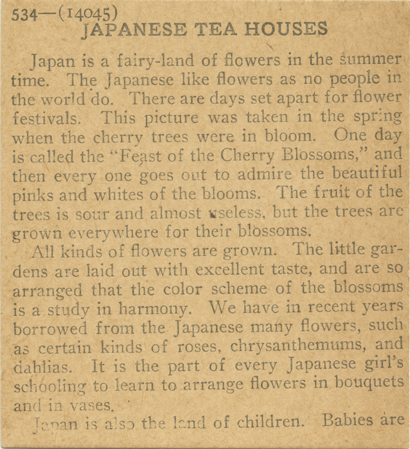 Japan is a fairy-land of flowers in the summer time. The Japanese like flowers as no people in the world do. There are days set apart for flower festivals. This picture was taken in the spring when the cherry trees were in bloom. One day is called the "Feast of the Cherry Blossoms," and then every one goes out to admire the beautiful pinks and whites of the blooms. The fruit of the trees is sour and almost useless, but the trees are grown everywhere for their blossoms. All kinds of flowers are grown. The little gardens are laid our with excellent taste, and are so arranged that the color scheme of the blossoms is a study of harmony. We have in recent years borrowed from the Japanese many flowers, such as certain kinds of roses, chrysanthemums, and dahlias. It is the part of every Japanese girl's schooling to learn to arrange flowers in bouquets and in vases. Japan is also the land of children. Babies are