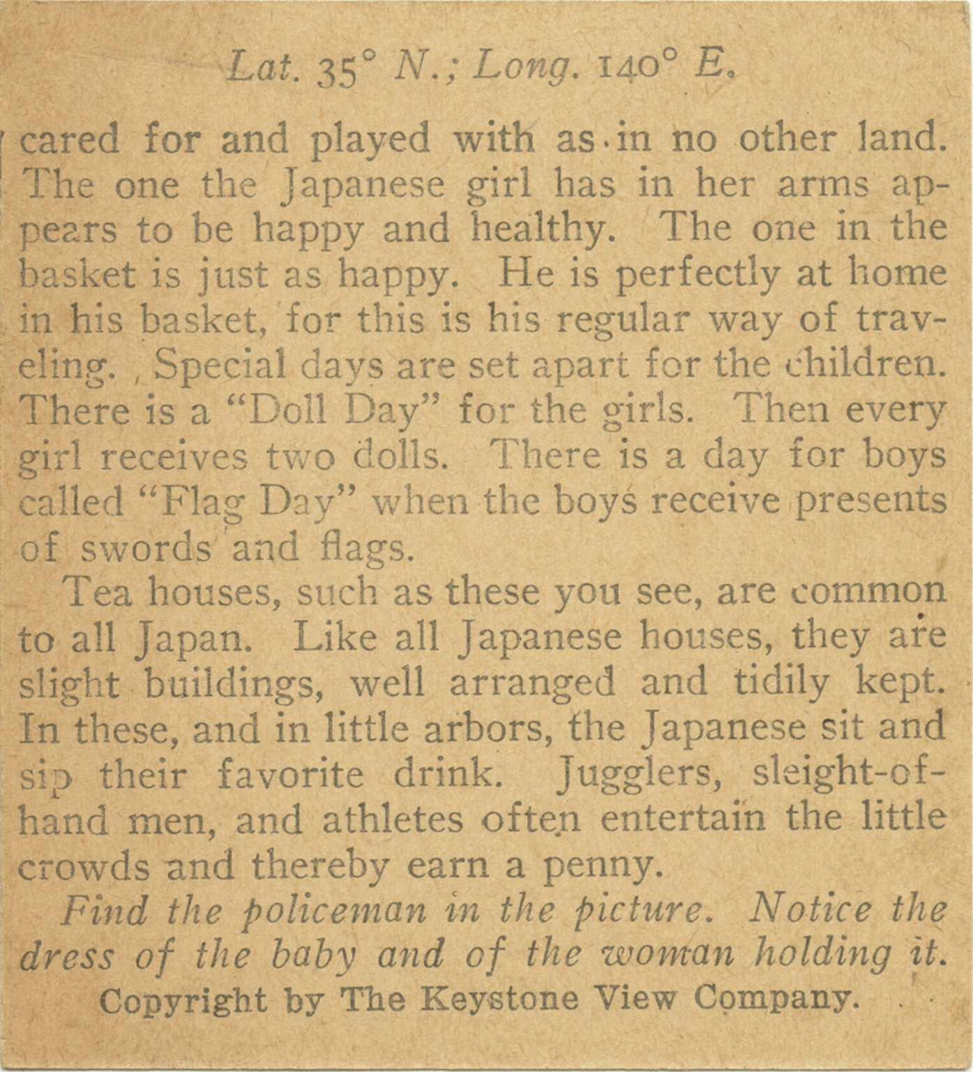 cared for and played with as in no other land. The one the Japanese girl has in her arms appears to be happy and healthy. The one in the basket is just as happy. He is perfectly at home in his basket, for this is his regular way of traveling. Special days are set apart for the children. There is a "Doll Day" for the girls. Then every girl receives two dolls. There is a day for boys called "Flag Day" when the boys receive presents of swords and flags. Tea houses, such as these you see, are common to all Japan. Like all Japanese houses, they are slight buildings, well arranged and tidily kept. In these, and in little arbors, the Japanese sit and sip their favorite drink. Jugglers, sleight-of-hand men, and athletes often entertain the little crowds and thereby earn a penny. Find the policeman in the picture. Notice the dress of the baby and of the woman holding it.