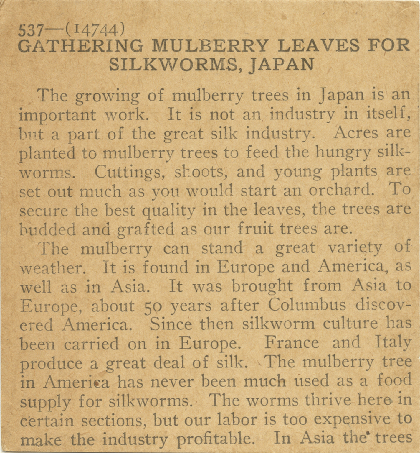 The growing of mulberry trees in Japan is an important work. It is not an industry in itself, but a part of the great silk industry. Acres are planted to mulberry trees to feed hungry silkworms. Cutting, shoots, and young plants are set out much as you would start an orchard. To secure the best quality in the leaves, the trees are budded and grafted as our fruit trees are. The mulberry can stand a great variety of weather. It is found in Europe and America, as well as in Asia. It was brought from Asia to Europe, about 50 years after Columbus discovered America. Since then silkworm culture has been carried on in Europe. France and Italy produce a great deal of silk. The mulberry tree in America has never been much used as a food supply for silkworms.The worms thrive here in certain sections, but our labor is too expensive to make the industry profitable. In Asia the trees