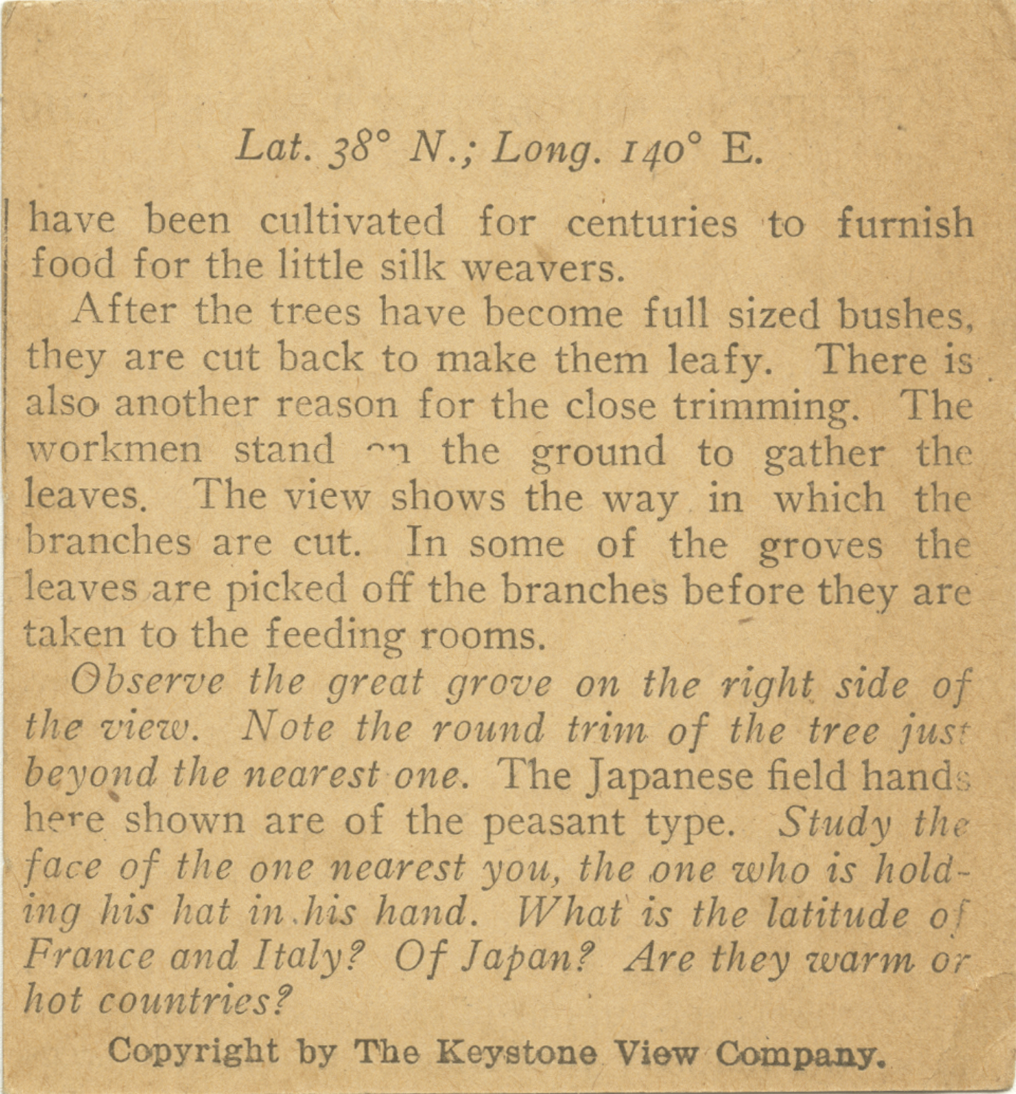 have been cultivated for centuries to furnish food for the little silk weavers. After the trees have become full sized bushes, they are cut back to make them leafy. There is also another reason for the close trimming. The workmen stand on the ground to gather the leaves. The view shows the way in which the branches are cut. In some of the groves the leaves are picked off the branches before they are taken to the feeding rooms. Observe the great grove on the right side of the view. Note the round trim of the tree just beyond the nearest one. The Japanese field hands here shown are of the peasant type. Study the face of the one nearest you, the one who is holding his hat in his hand. What is the latitude of France and Italy? Of Japan? Are they warm or hot countries?