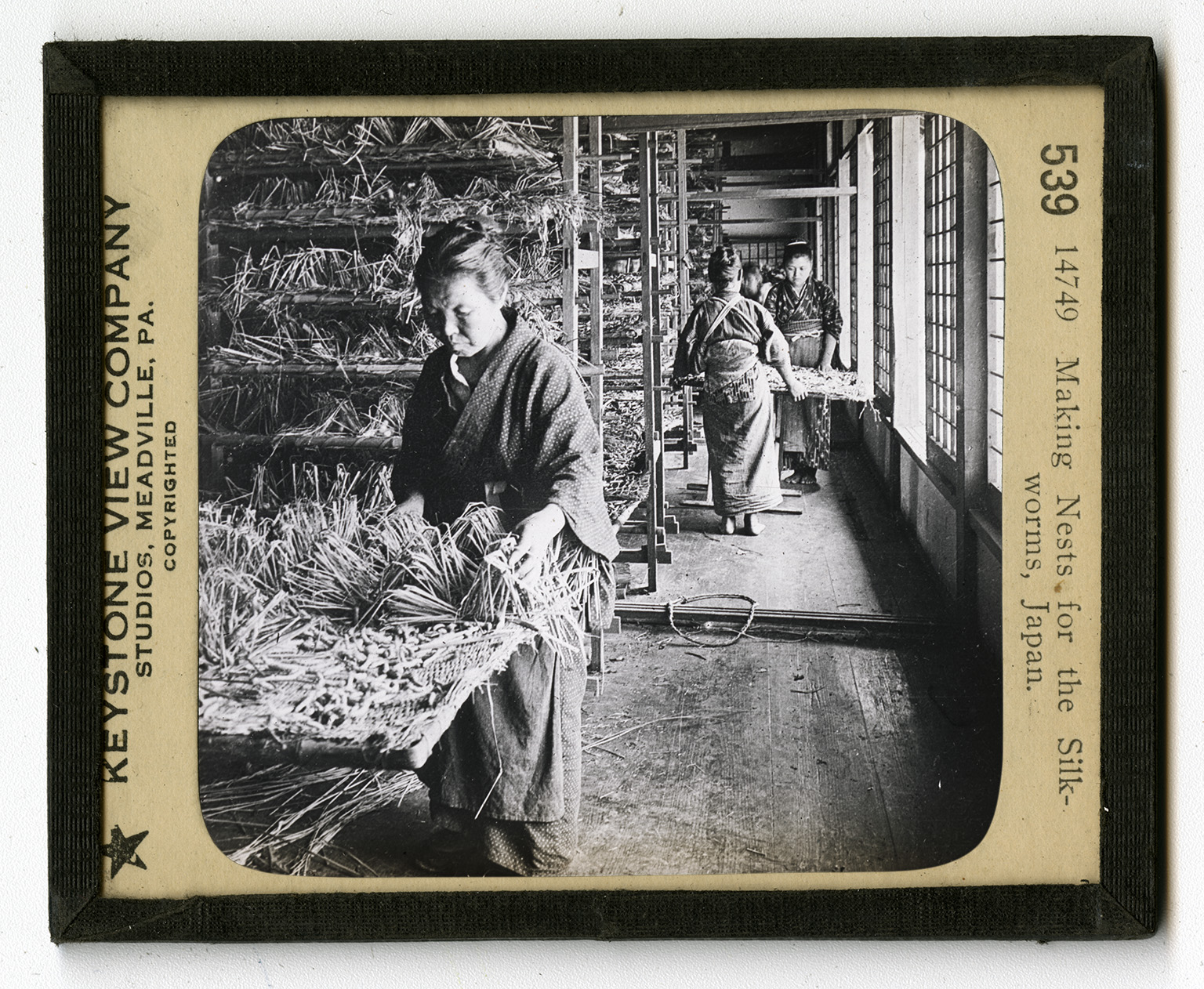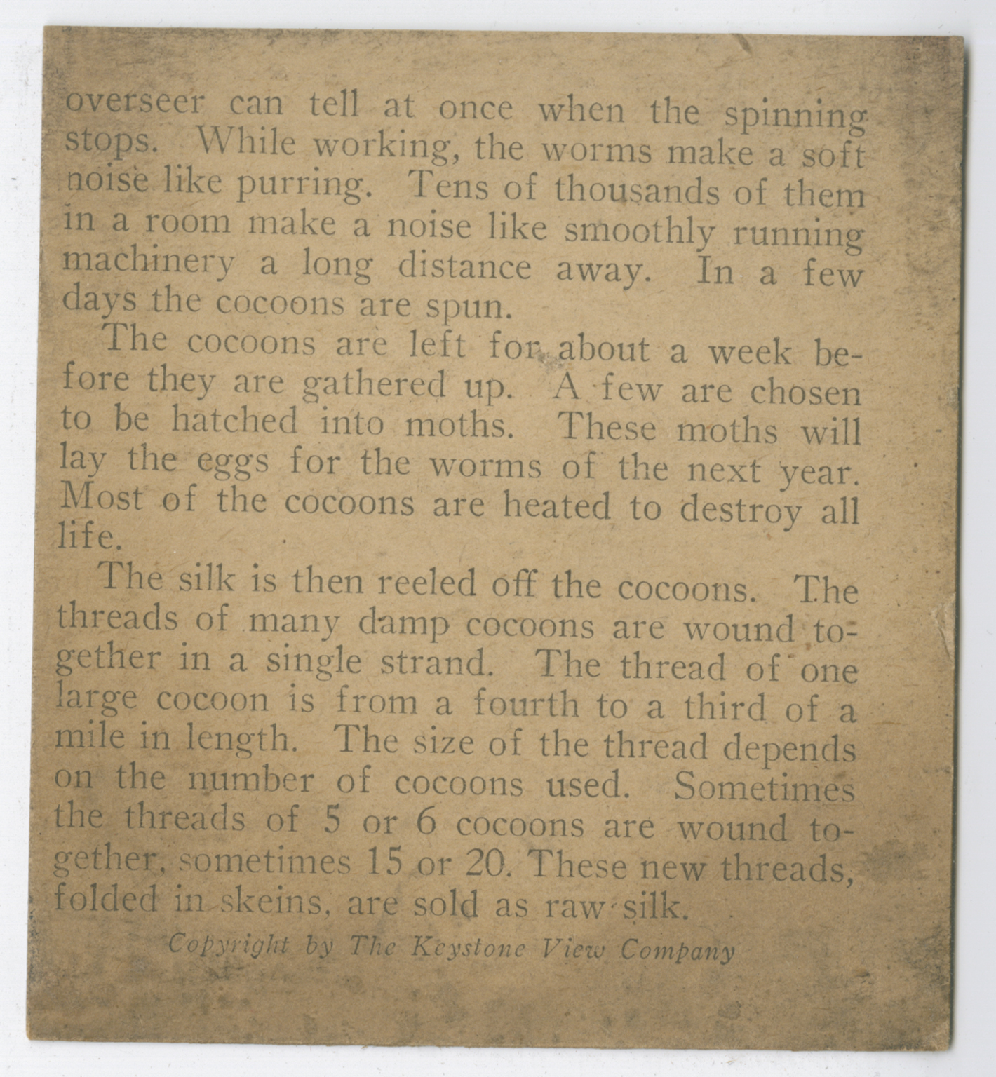 overseer can tell at once when the spinning stops. While working, the worms make a soft noise like purring. Tens of thousands of them in a room make a noise like smoothly running machinery a long distance away. In a few days the cocoons are spun. The cocoons are left for about a week before they are gathered up. A few are chosen to be hatched into moths. These moths will lay the eggs for the worms of the next year. Most of the cocoons are heated to destroy all life. The silk is then reeled off the cocoons. The thread of many damp cocoons are wound together in a single strand. The thread of one large cocoon is from a fourth to a third of a mile in lenght. The size of the thread depends on the number of cocoons used. Sometimes the threads of 5 or 6 cocoons are wound together, sometimes 15 or 20. These new threads, folded in skeins, are sold as raw silk.