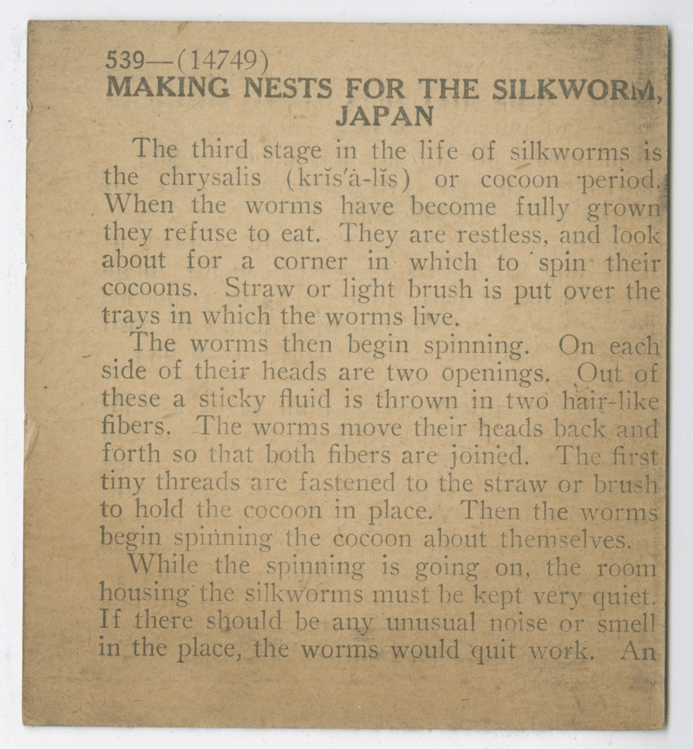 The third stage in the life of silkworms is the chrysalis or cocoon period. When the worms have become fully grown they refuse to eat. They are restless, and look about for a corner in which to spin their cocoons. Straw or light brush is put over the trays in which the worms live. The worms then begin spinning. On each side of their heads are two openings. Out of these a sticky fluid is thrown in two hair like fibers. The worms move their heads back and fourth so that both fibers are joined. The first tiny threads are fastened to the straw or brush to hold the cocoon in place. Then the worms begin spinning the cocoon about themselves. While the spinning is going on, the room housing the silkworms must be kept very quiet. If there should be any unusual noise or smell in the place, the worms would quit work. An
