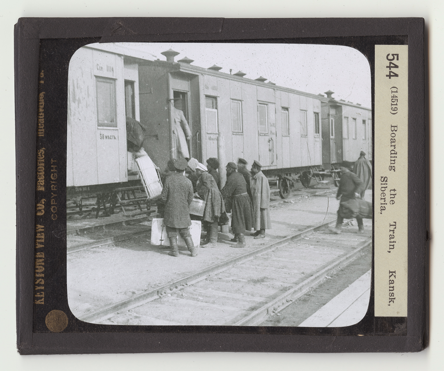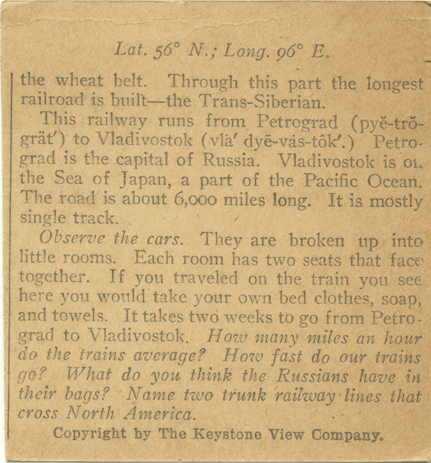 the wheat belt. Through this part the longest railroad is built - the Trans-Siberian. This railway runs through Petrograd to Vladivostok. Petrograd is the capital of Russia. Vladivostok is on the Sea of Japan, a part of the Pacific Ocean. The road is about 6,000 miles long. It is mostly single track. Observe the cars. They are broken up into little rooms. Each room has two seats that face together. If you traveled on the train you see here you would take your own bed clothes, soap, and towels. It takes two weeks to get from Petrograd to Vladivostok. How many miles an hour do the trains average? How fast do our trains go? What do you think the Russians have in their bags? Name two trunk railway lines that cross North America.