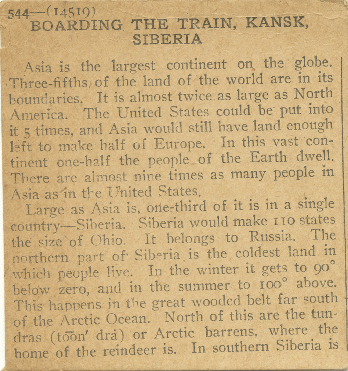 Asia is the largest continent on the globe. Three fifths of the land aof the world are in its boundaries. It is almost twice as large as North America. The United States could be put into it 5 times, and Asia would still have land enough left to make half of Europe. In this vast continent one-half the people of the Earth dwell. There are almost nine times as many people in Asia in the United States. Large as Asia is, one-third of it is in a single country - Siberia. Siberia would make 110 states the size of Ohio. It belongs to Russia. The northern part of Siberia is the coldest land in which people live. In the winter it get to 90 below zero, and in the summer to 100 above. This happens in the great wooded belt far south of the Arctic Ocean. North of this are the tundras or Arctic barrens, where the home of the reindeer is. In southern Siberia is