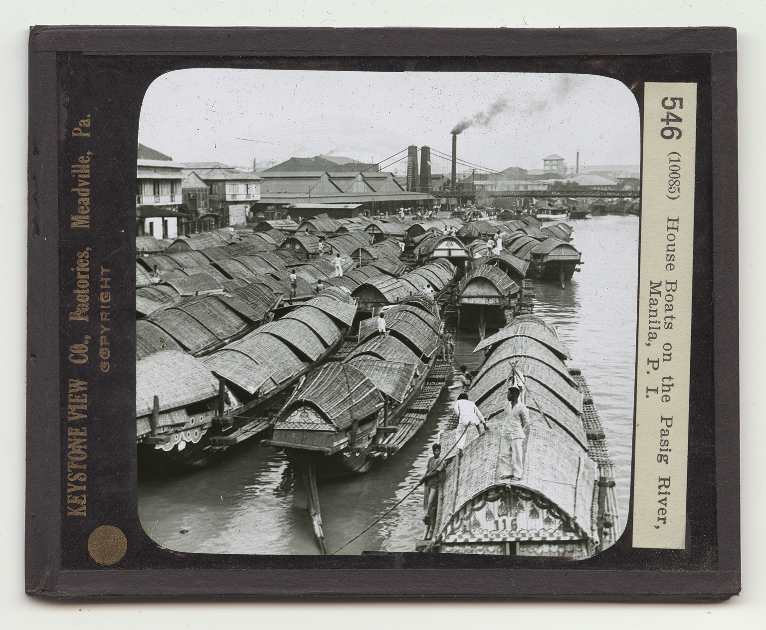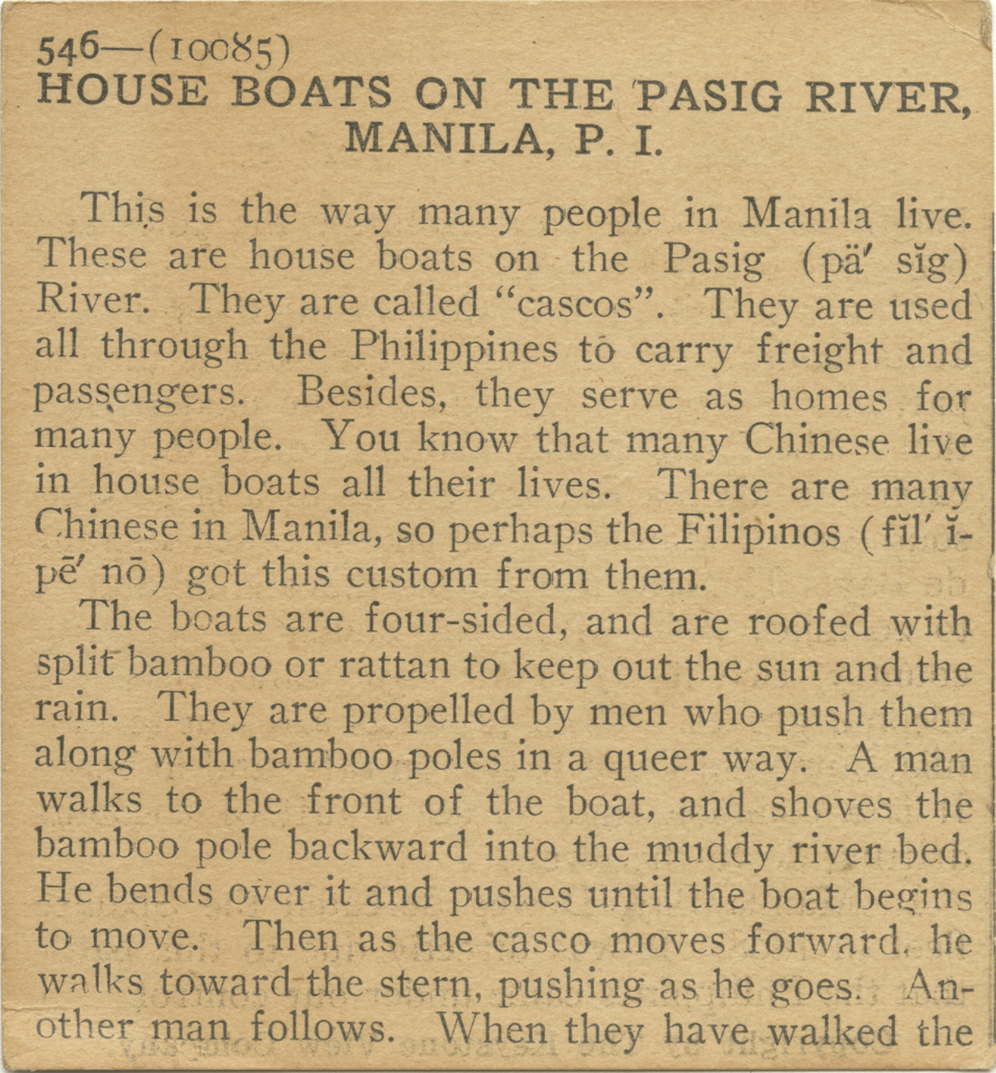 This is the way many people in Manila live. These are house boats on the Pasig River. They are called "cascos". They are used all through the Philippines to carry freight and passengers. Besides, they serve as homes for many people. You know that many Chinese live in house boats all their lves. There are many Chinese in Manila, so perhaps the Filipinos got this custom from them. The boats are four-sided, and are roofed with split bamboo or rattan to keep out the sun and the rain. They are propelled by men who push them along with bamboo poles in a queer way. A man walks to the front of the boat, and shoves the bamboo pole backward into the muddy river bed. He bends over it and pushes until the boat begins to move. Then as the casco moves forward, he walks toward the stern, pushing as he goes. Another man follows. When they have walked the