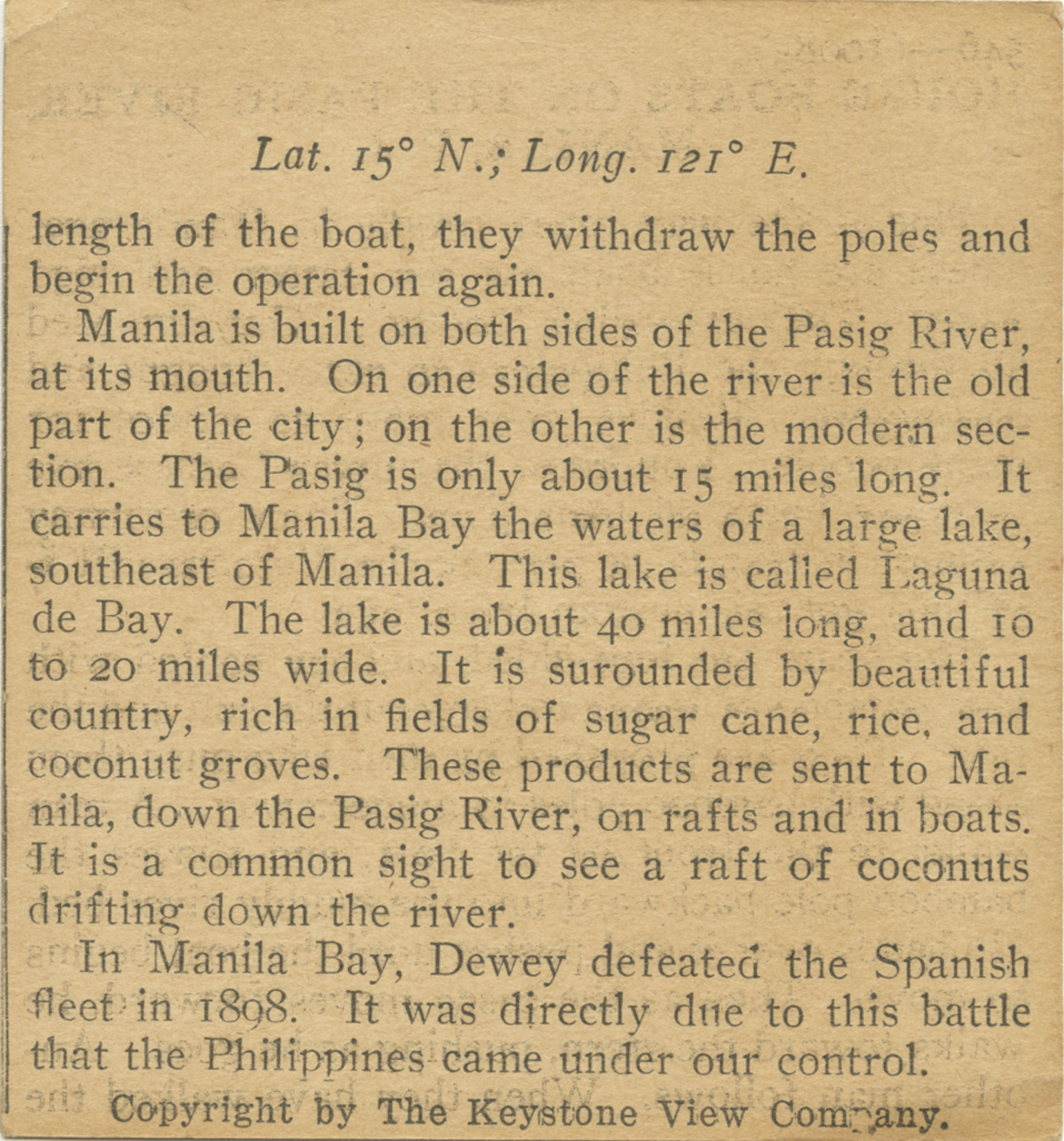 lenght of the boat, they withdraw the poles and begin the operation again. Manila is built on both sides of the Pasig River, at its mouth. On one side of the river is the old part of the city; on the other is the modern section. The Pasig is only about 15 miles long. It carries to Manila Bay the waters of a large lake, southwest of Manila. This lake is called Laguna de Bay. The lake is about 40 miles long, and 10 to 20 miles wide. It is surrounded by beautiful country, rich in fields of sugar cane, rice, and coconut groves. These products are sent to Manila, down the Pasig River, on rafts and in boats. It is a common sight to see a raft of coconuts drifting down the river. In Manila Bay, Dewey defeated the Spanish fleet in 1898. It was directly due to the battle that the Philippines came under our control.
