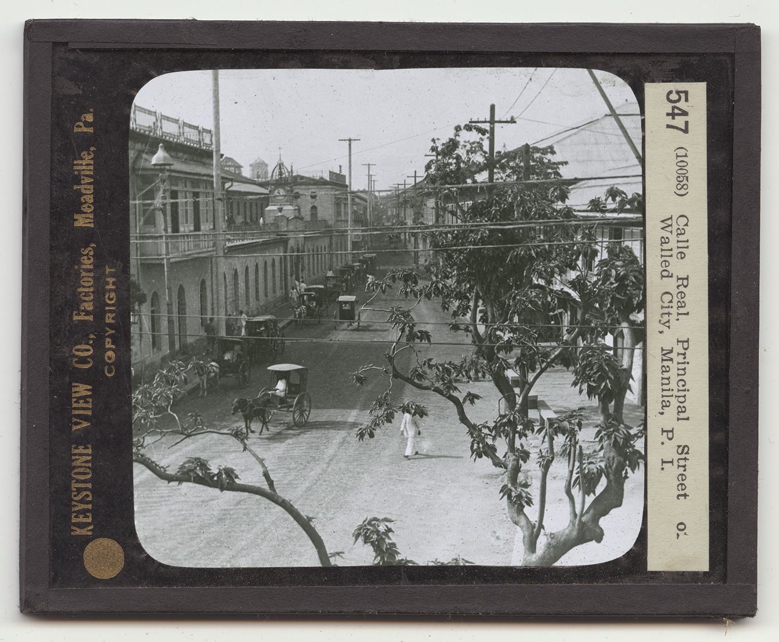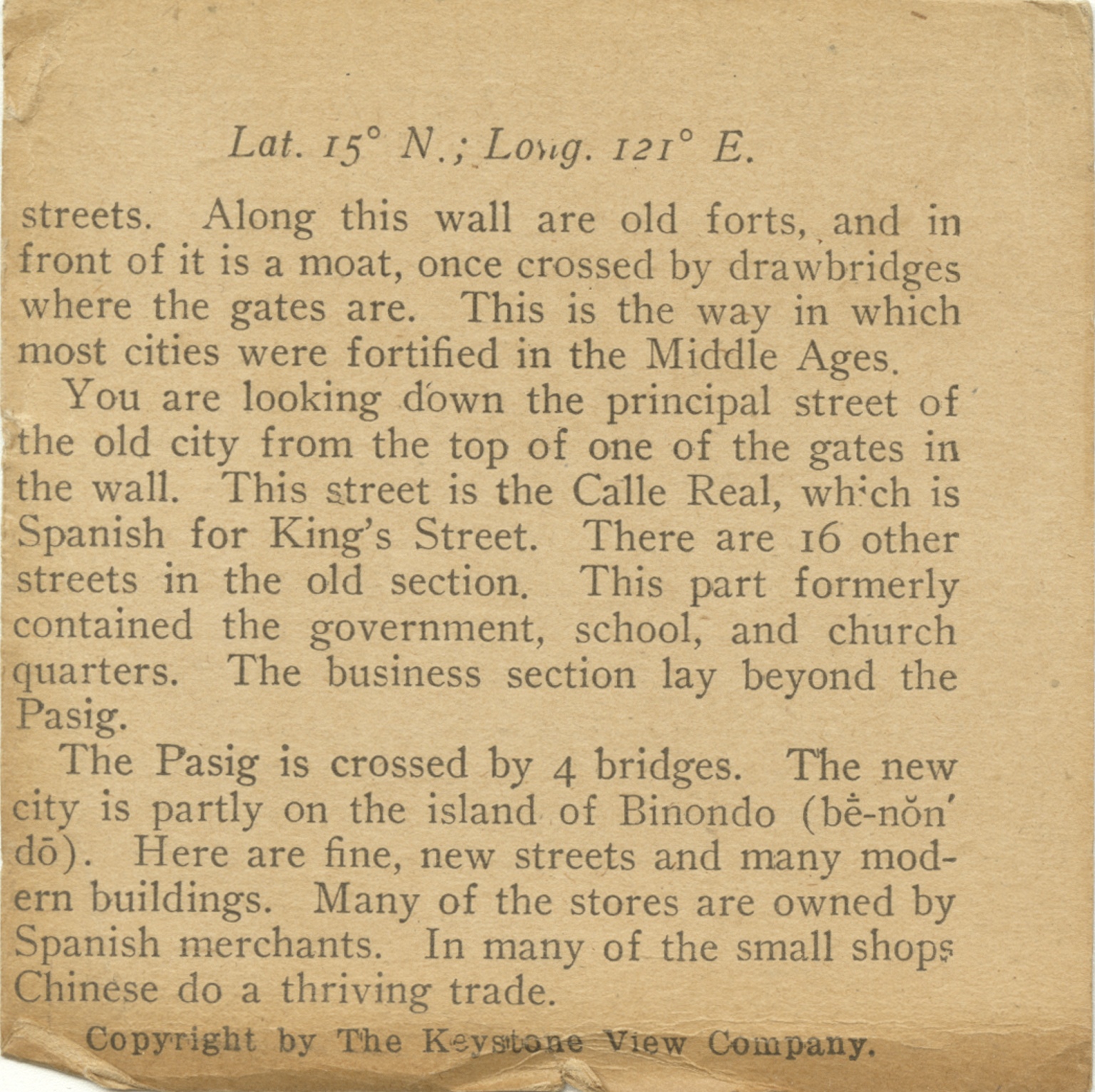 streets. Along this wall are old forts, and in front of it is a moat, once crossed by a drawbridges where the gates are. This is the way in which most cities were fortified in the Middle Ages. You are looking down the principal street of the old city from the top of one of the gates in the wall. This street is the Calle Real, which is Spanish for King's Street. There are 16 other streets in the old section. This part formerly contained the government, school, and church quarters. The business section lay beyond the Pasig. The Pasig is crossed by 4 bridges. The new city is partly on the island of Binondo. Here are fine, new streets and many modern buildings. Many of the stores are owned by Spanish merchants. In many of the small shops Chinese do a thriving trade.