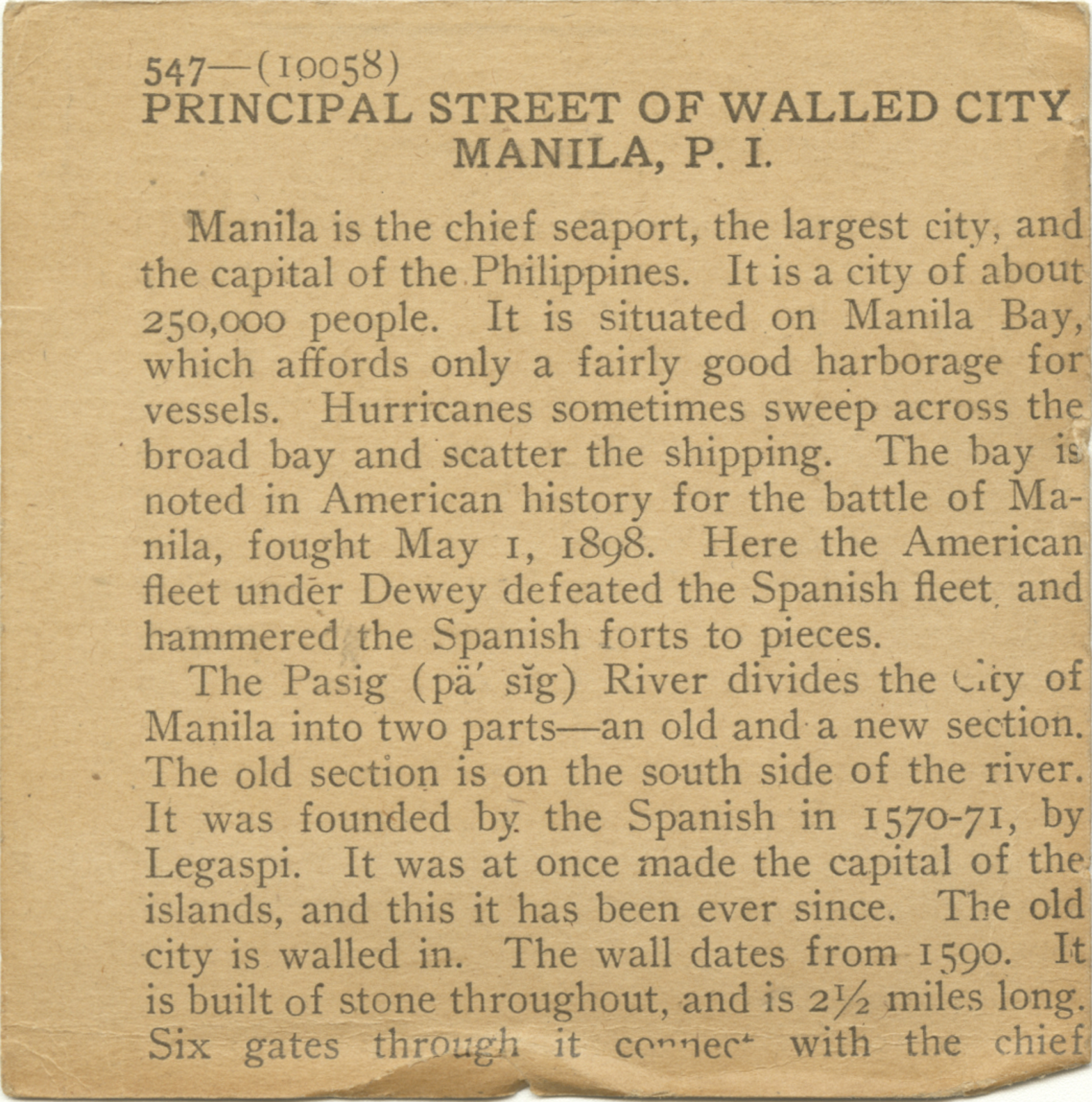 Manila is the chief seaport, the largest city, and the capital of the Philippines. It is a city of about 250,000 people. It is situated on Manila Bay, which affords only a fairly good harborage for vessels. Hurricanes sometimes sweep across the broad bay and scatter the shipping. The bay is noted in American history for the battle of Manila, fought May 1, 1898. Here the American fleet under Dewey defeated the Spanish fleet, and hammered the Spanish forts to pieces. The Pasig River divides the City of Manila into two parts - an old and a new section. The old section is on the south side of the river. It was founded by the Spanish in 1570-71, by Legaspi. It was at once made the capital of the islands, and this it has been ever since. The old city is walled in. The wall dates from 1590. It is built of stone throughout, and is 2 1/2 miles long. Six gates through it connect with the chief