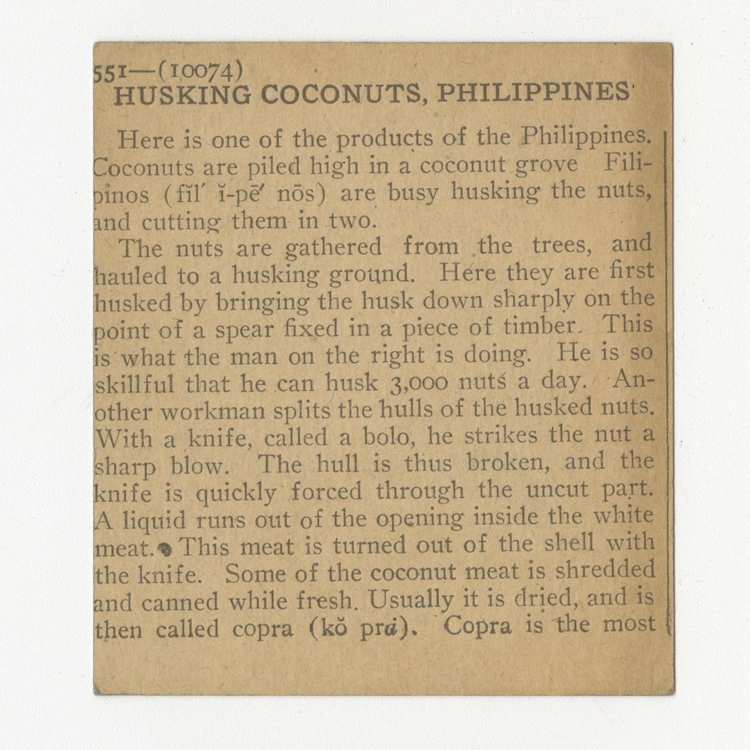 Here is one of the products of the Philippines. Coconuts are piled high in a coconut grove. Filipinos are busy husking the nuts, and cutting them in two. The nuts are gathered from the trees, and hauled to a husking ground. Here they are first husked by a bringing the husk down sharply on the point of a spear fixed in a piece of timber. This is what the man on the right are doing. He is so skillful that he can husk 3,000 nuts a day. Another workman splits the hulls of the husked nuts. With a knife, called a bolo, he strikes the nut a sharp blow. The hull is thus brokem, and the knife is quickly forced through the uncut part. A liquid runs out of opening inside the white meat. This meat is turned out of the shell with the knife. Some of the coconut meat is shredded and canned while fresh. Usually it is dried, and is then called copra. Copra is the most