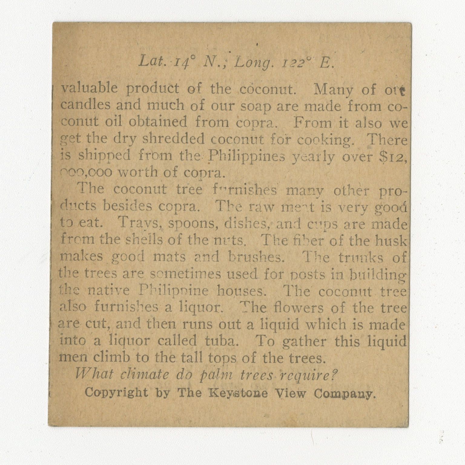valuable product of the coconut. Many of our candles and much our soap are made from coconut oil obtained from copra. From it also we get dry shredded coconut for cooking. There is shipped from the Philippines yearly over $12,000,000 worth of copra. The coconut tree furnishes many other products besides copra. The raw meat is very good to eat. Trays, spoons, dishes, and cups are made from shells of the nuts. The fiber of the husk makes good mats and brushes. The trunks of the trees are sometimes used for posts in building the native Philippine houses. The coconut tree also furnishes a liquor. The flowers of the tree are cut, and then runs out a liquid which is made into a liquor called tuba. To gather this liquid men climb to the tall tops of the trees. What climate do palm trees require?