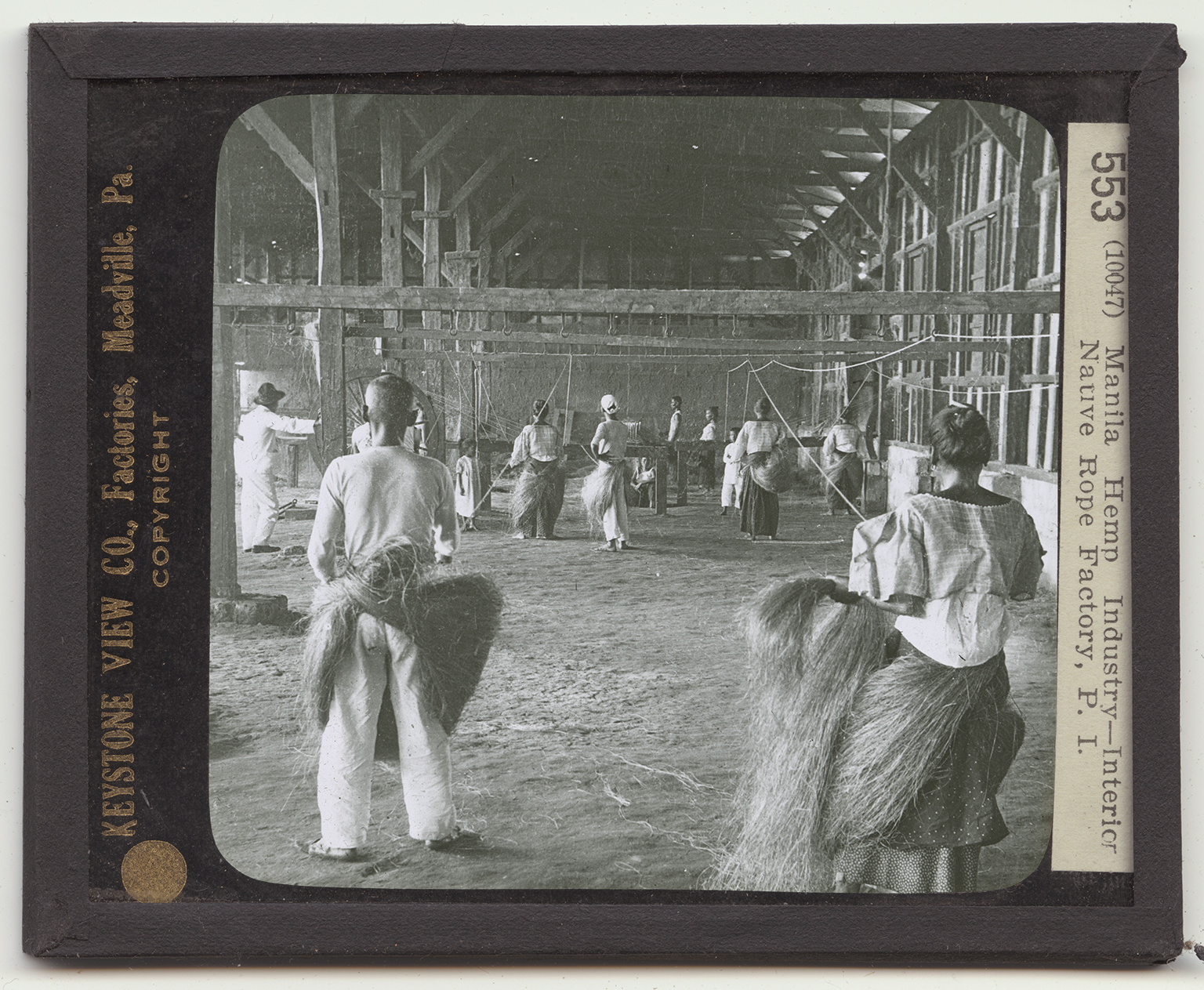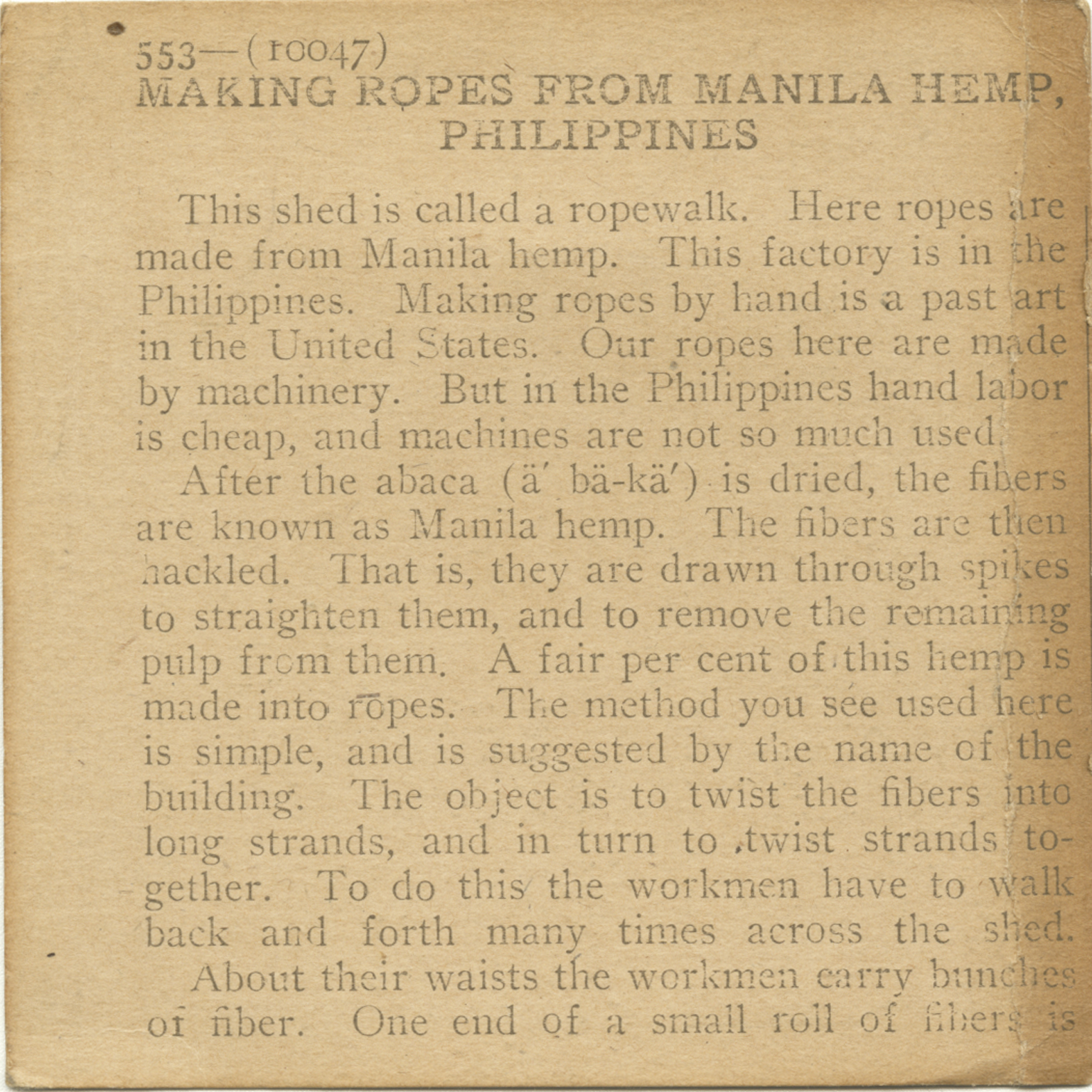 This shed is called a ropewalk. Here ropes are made from Manila hemp. This factory is in the Philippines. Making ropes by hand is a past art of the United States. Our ropes here are made by machinery. But in the Philippines hand labor is cheap, and machines are not so much used. After the abaca is dried, the fibers are known as Manila hemp. The fibers are then hackled. That is, they are drawn through spikes to straighten them, and to remove the remaining pulp from them. A fair per cent of this hemp is made into ropes. The method you see used here is simple, and is suggested by the name of the building. The object is to twist the fibers into long strands, and in turn to twist strands together. To do this the workmen have to walk back and fourth many times across the shed. About their waists the workmen carry bunches of fiber. One end of a small roll of fibers is