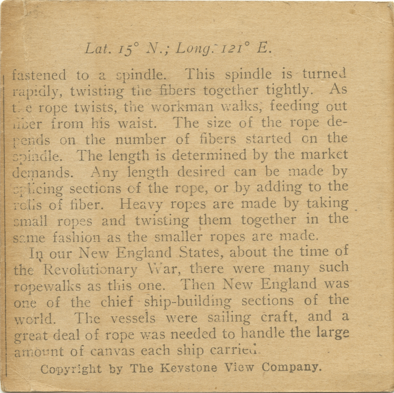 fastened to a spindle. This spindle is turned rapidly, twisting the fibers together tightly . As the rope twists, the workman walks, feeding out fiber from his waist. The size of the rope depends on the number of fibers started on the spindle. The lenght is determined by the market demands. Any lenght desired can be made by splicing sections of the rope, or by taking small ropes and twisting them together in the same fashion as the smaller ropes are made. In our New England states, about the time of the Revolutionary War, there were many such ropewalks as this one. Then New England was one of the chief ship-building sections of the world. The vessels were sailing craft, and a great deal of rope was needed to handle the large amount of canvas each ship carried.