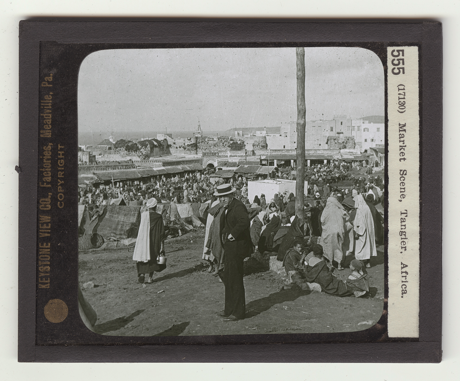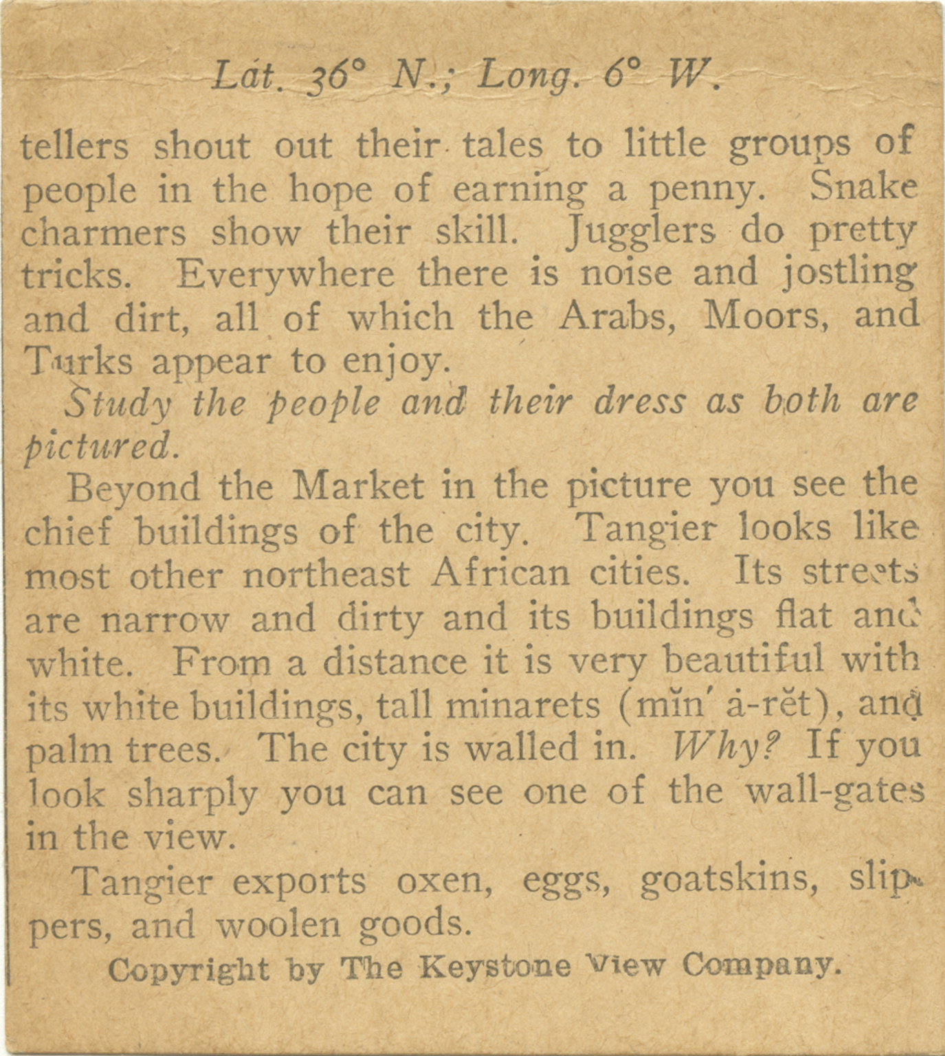 Tangier is the most important commercial city in the province of Morocco, Africa. It is a seaport on the Strait of Gibraltar, 35 miles southwest of the city of Gibraltar. It is a city of 40,000 people of all kinds and nations. It was settled by the Phoenicians nobody knows when. But it was a thriving ity when Augustus Ceasar ruled in Rome, and at that time it belonged to the Romans. Now the province of Morocco is ruled by a native, but it is really managed by the great nations of Europe. In the picture, you are looking at the most interesting part of Tangier. This is the Outer Market. Here in a great area of rough ground just outside the gates gather crowds of natives to visit, to sell, to buy, or to be entertained. Market days are Thursdays and Saturdays. Tents of blankets and shawls are thrown up as booths or as living quarters. Women in white robes with white veils offer their goods for sale. Story-