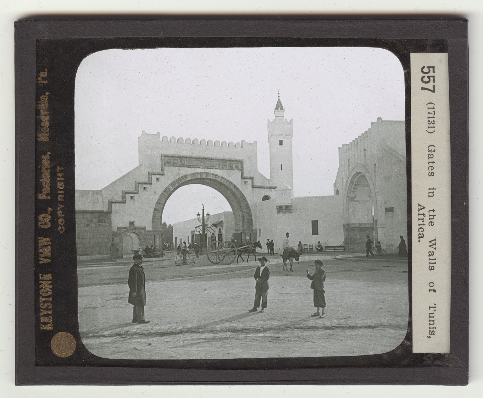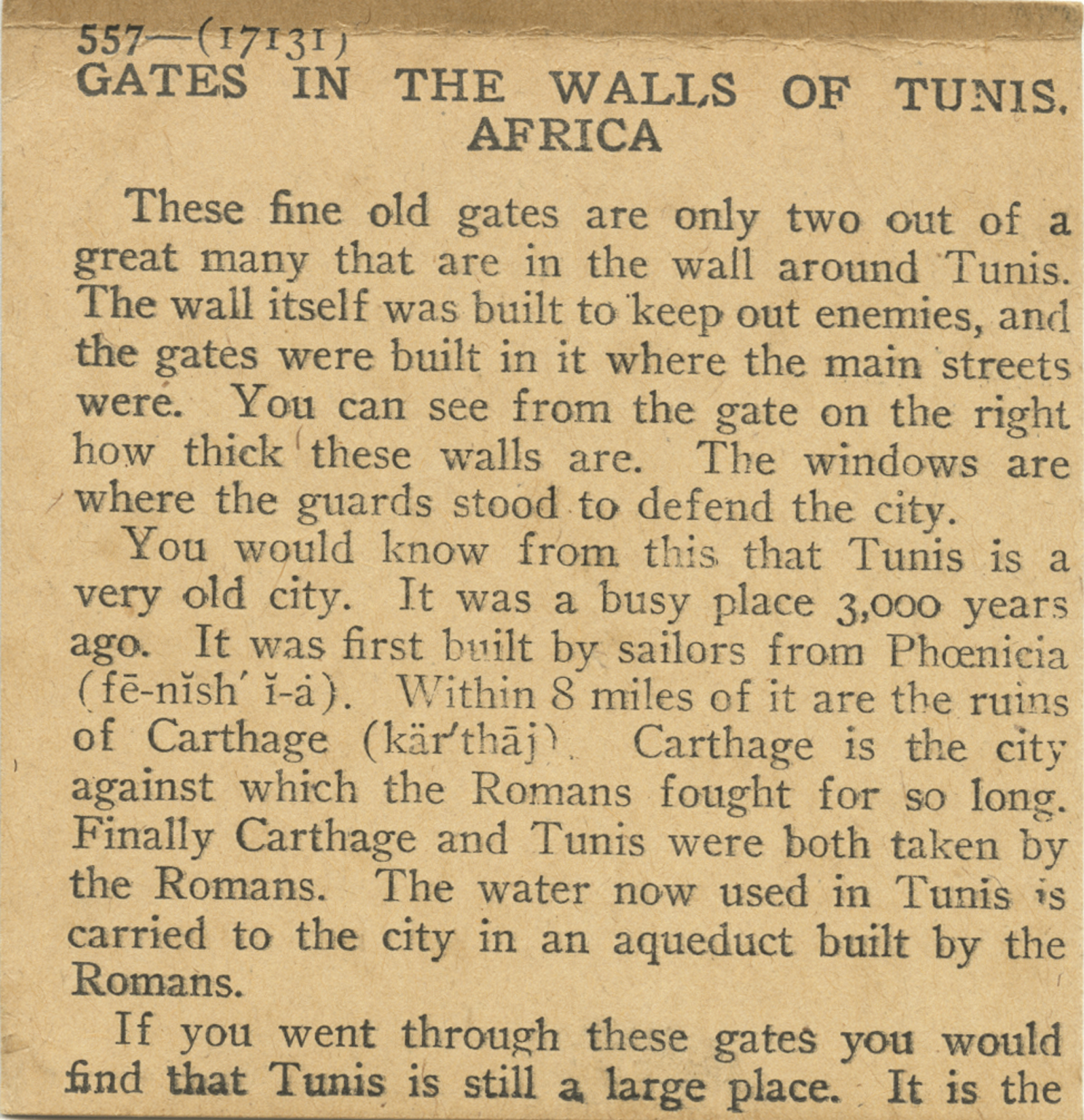These fine old gates are only two out of a great many that are in the wall around Tunis. The wall itself was built to keep out enemies, and the gates were built in it where the main streets were. You can see from the gate on the right where the guards stood to defend the city. You would know from this that Tunis is a very old city. It was a busy place 3,000 years ago. It was first built by sailors from Phoenicia. Within 8 miles of it are the ruins of Carthage. Carthage is the city against which the Romans fought for so long. Finally Carthage and Tunis were both taken by the Romans. The water now used in Tunis is carried to the city in an aqueduct built by the Romans. If you went though these gates you would find that Tunis is still a large place. It is the