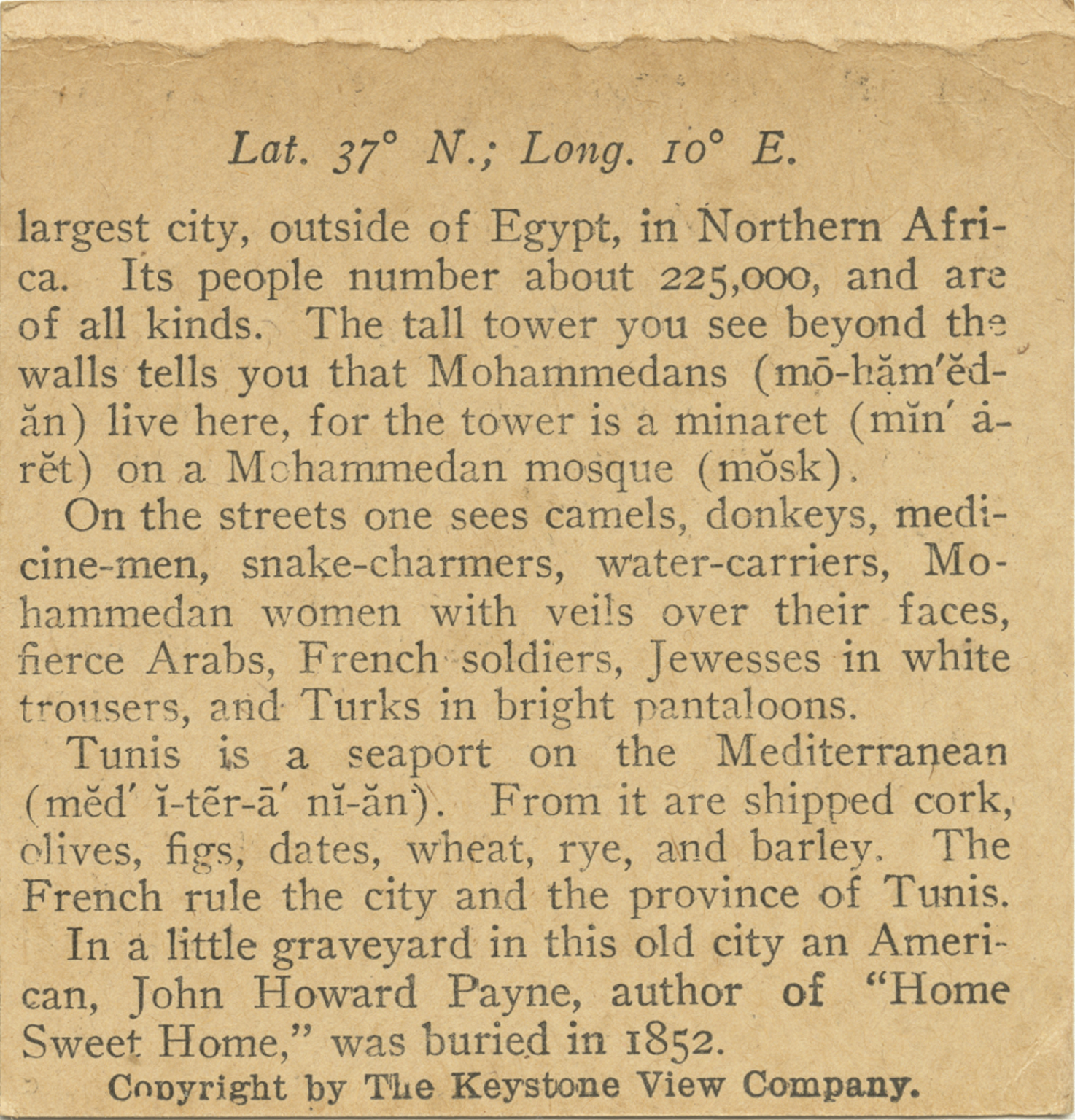largest city, outside of Egypt in Northern Africa. Its people number about 225,000 and are of all kinds. The tall tower you see beyond the walls tells you that Mohammedans live here, for the tower is a minaret on a Mohammedan mosque. On the streets one sees camels, donkeys, medicine-men, snake-charmers, water-carriers, Mohammedan women with veils over their faces, fierce Arabs, French soldiers, Jewesses in white trousers, and Turks in bright pantaloons. Tunis is a seaport on the Mediterranean. From it are shipped cork, olives, figs, dates, wheat, rye, and barley. The French rule the city and the province of Tunis. In a little graveyard in this old city an American, John Howard Payne, author of "Home Sweet Home," was burried in 1852.