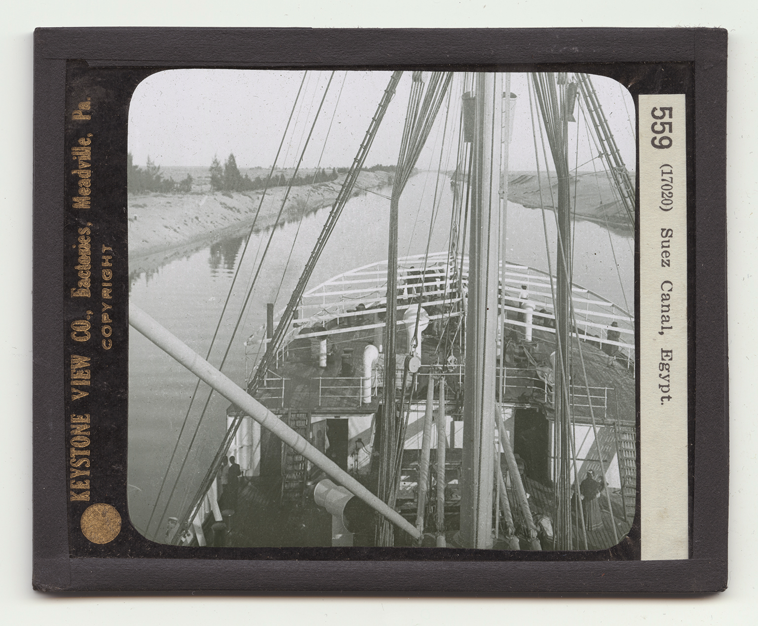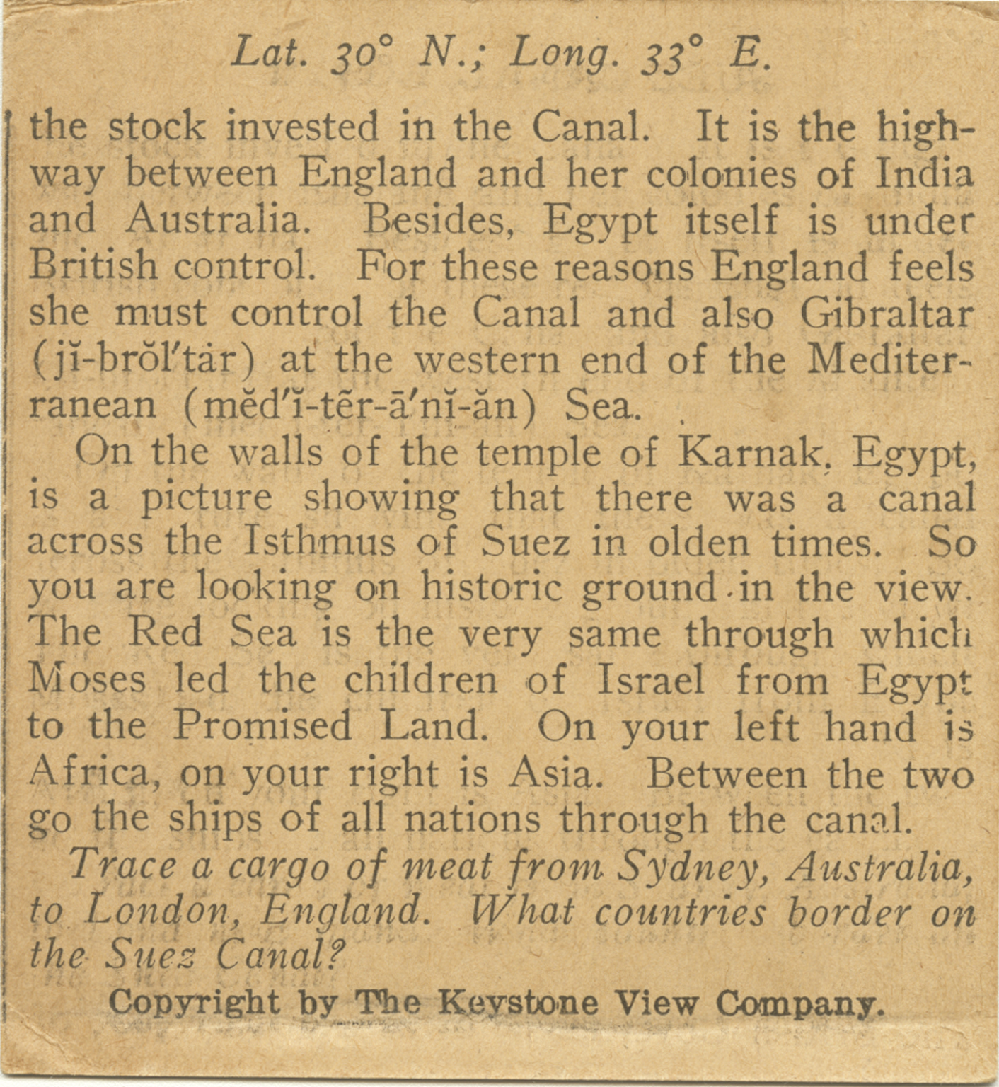 the stock invested in the Canal. It is the highway between England and her colonies of India and Australia. Besides, Egypt itself is under British control. For these reasons England feels she must control the Canal and also Gibraltar at the western end of the Miditerraen Sea. On the walls of the temple of Karnak, Egypt, is a picture showing that there was a canal across the Isthmus of Suez in olden times. So you are looking on historic ground in the view. The Red Sea is the very same through which Moses led the children of Israel from Egypt to the Promised Land. On your left hand is Africa, on your right is Asia. Between the two go the ships of all nations through the canal. Trace a cargo of meat from Sydney, Australia, to London, England. What countries border on the Suez Canal?