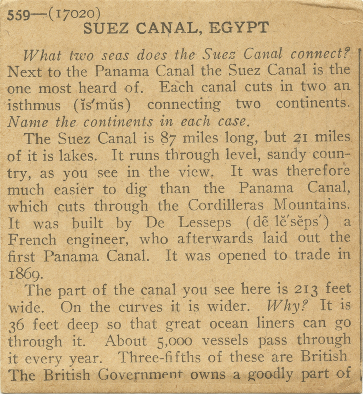 What two seats does the Suez Canal connect? Next to the Panama Canal the Suez Canal is the one most heard of. Each canal cuts in two an isthmus connecting two continents. Name the continents in each case. The Suez Canal is 87 miles long, but 21 miles of it is lakes. It runs through level, sandly country, as you see in the view. It was therefore much easier to dig than the Panama Canal, which cuts through the Cordielleras Mountains. It was built by De Lesseps a French engineer, who afterwards laid out the first Panama Canal. It was opened to trade in 1869. The part of the canal you see here is 213 feet wide. On the curves it is wider. Why? It is 36 feet deep so that great ocean liners can go through it every year. Three-fifths of these are British. The British Government owns a goodly part of