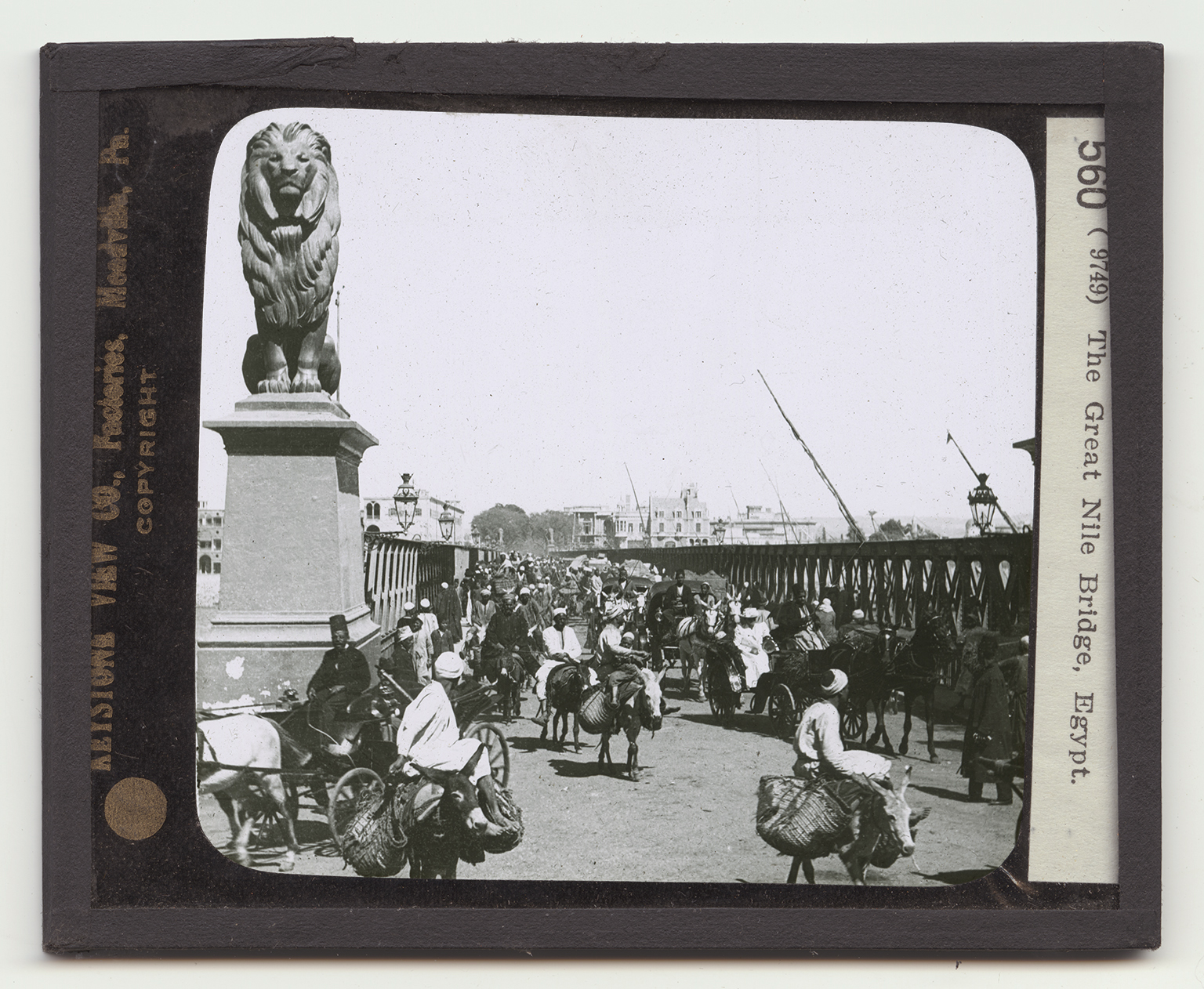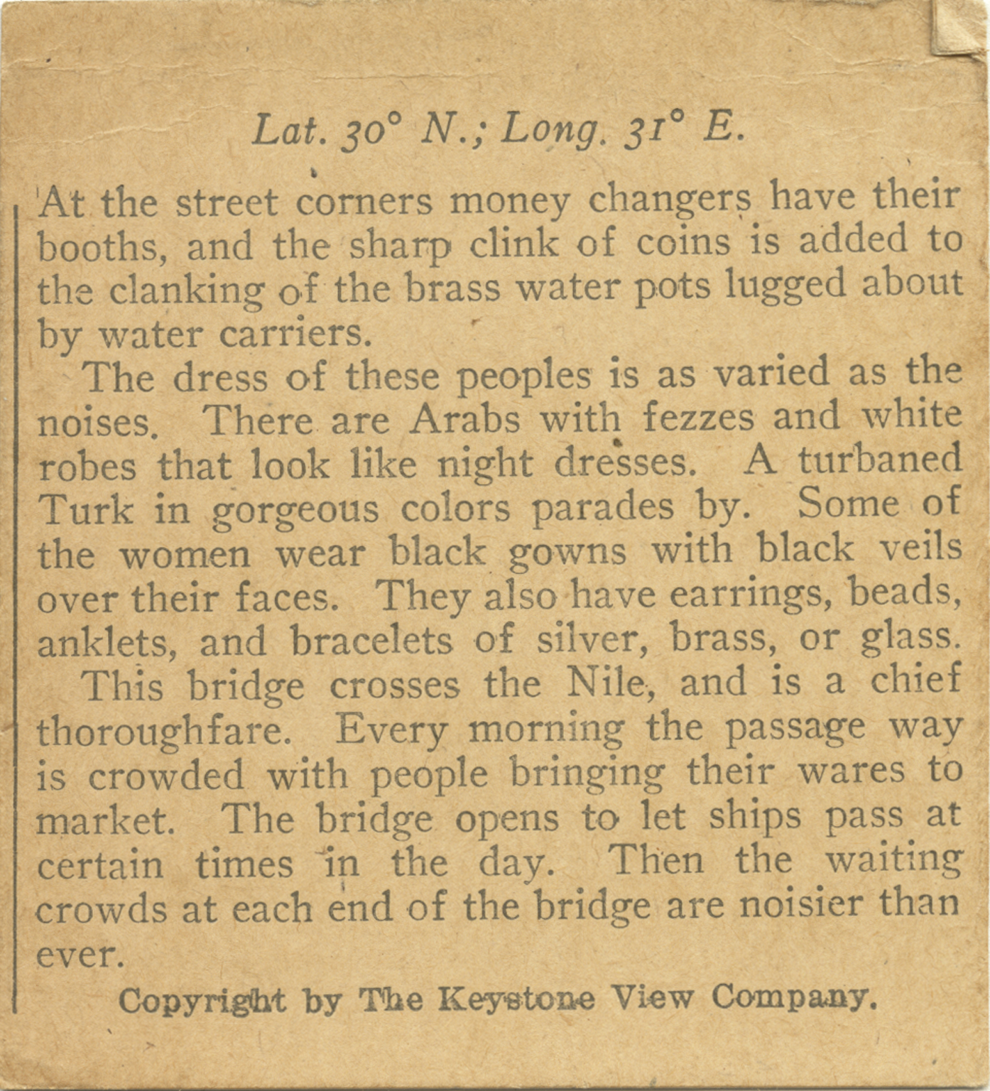 At the street corners money changers have their booths, and the sharp clink of coins is added to the clanking of the brass water pots lugged about by water carriers. The dress of these peoples is as varied as the noises. There are Arabs with fezzes and white robes that look like night dresses. A turbaned Turk in gorgeous colors parades by. Some of the women wear black gowns with black veils over their faces. They also have earrings, beads, anklets, and bracelets of silver, brass, or glass. This bridge crosses the Nile, and is a chief thoroughfare. Every morning the passage way is crowded with people bringing their wares to market. The bridge opens to let ships pass at certain times in the day. Then the waiting crowds at each end of the bridge are noisier than ever.