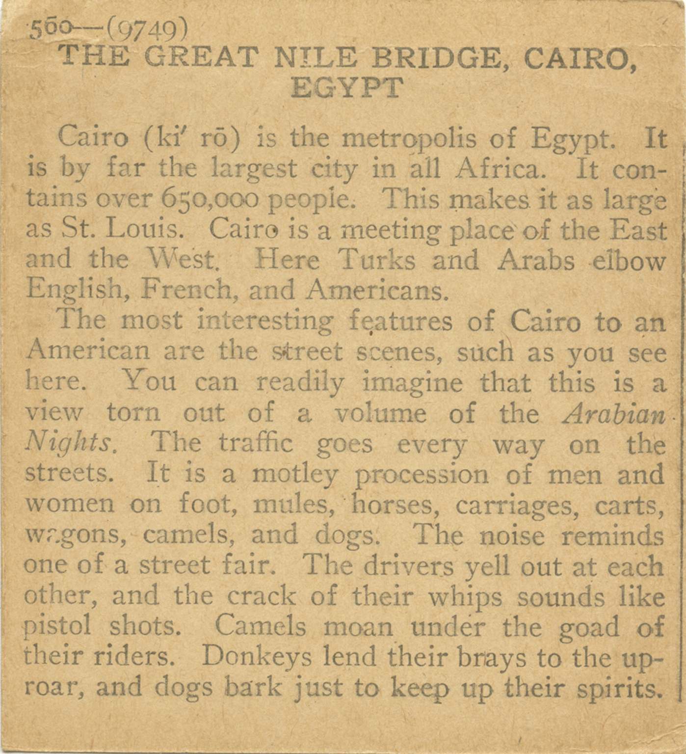 Cairo is the metropolis of Egypt. It is by far the largest city in all Africa. It contains over 650,000 people. This makes it as large as St. Louis. Cairo is a meeting place of the East and the West. Here Turks and Arabs elbow English, French, and Americans. The most interesting features of Cairo to an American are the street scenes, such as you see here. You can readily imagine that this is a view torn our of a volume of the Arabian Nights. The traffic goes every way on the streets. It is a motley procession of men and women on foot, mules, horses, carriages, carts, wagons, camels, and dogs. The noise reminds one of a street fair. The drivers yell out at each other, and the crack of their whips sound like pistol shots. Camels moan under the goad of their riders. Donkeys lend their brays to the uproar, and dogs bark just to keep up their spirits.