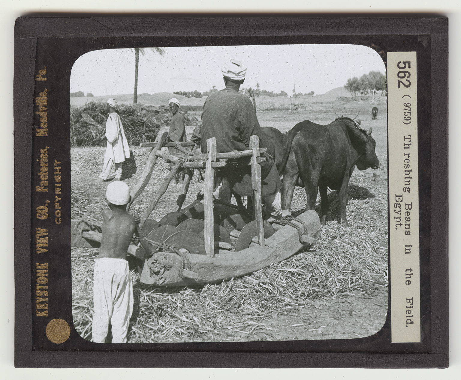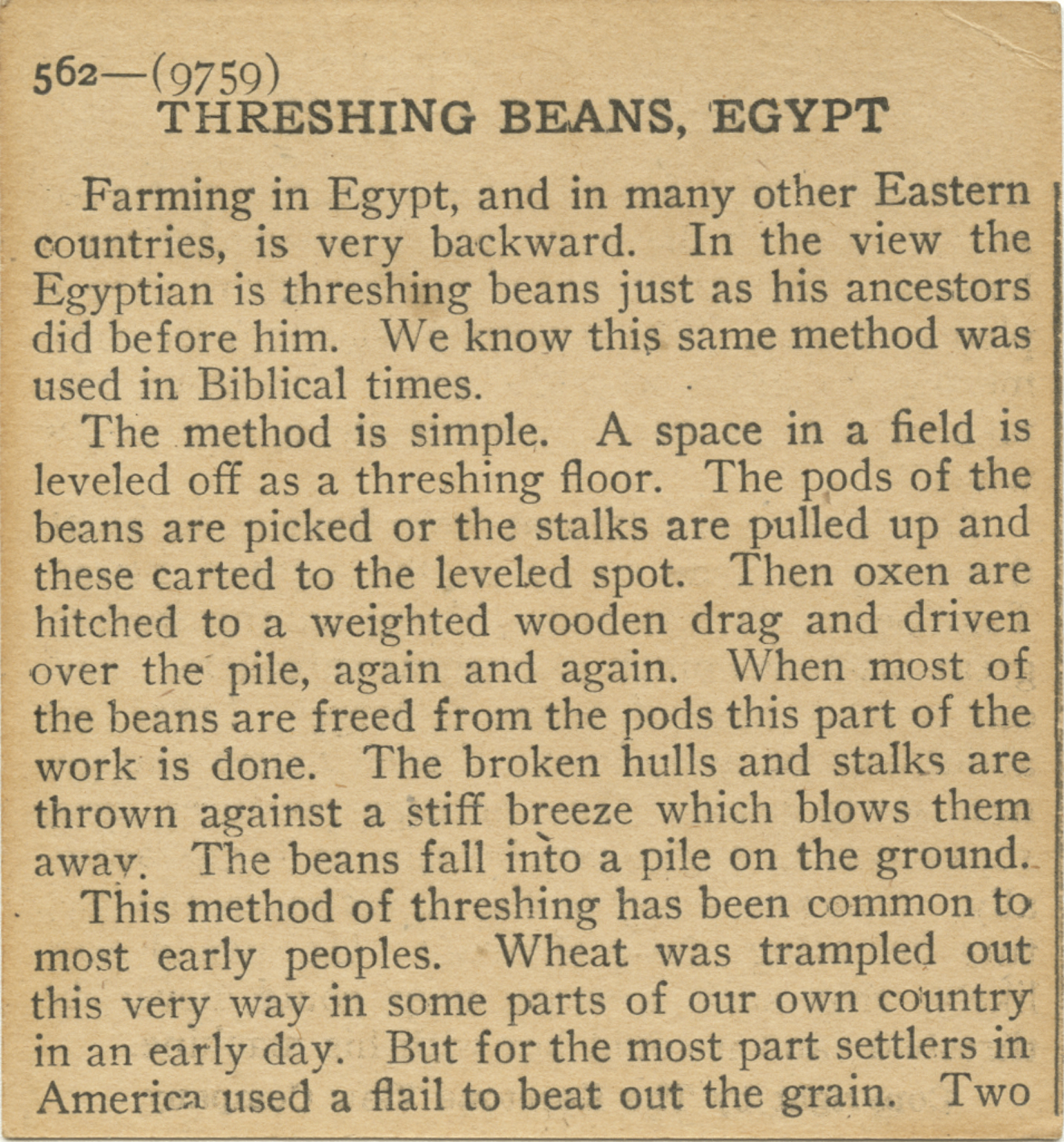 Farming in Egypt, and in many other Eastern countries is very backward. In the view the Egyptian is threshing beans just as his ancestors did before him. We know this same method was used in Biblical times. The method is simple. A space in a field is leveled off as a threshing floor. The pods of the beans are picked or the stalks are pulled up and these carted to the leveled spot. Then oxen are hitched to a weighted wooden drag and driven over the pile, again and again. When most of the beans are freed from the pods this part of the work is done. The broken hulls and stalks are thrown against a stiff breeze which blows them away. The beans fall into a pile on the ground. This method of threshing has been common to most early peoples. Wheat was trampled out this very way in some parts of our own country in an early day. But for the most part settlers in America used a flail to beat out the grain. Two