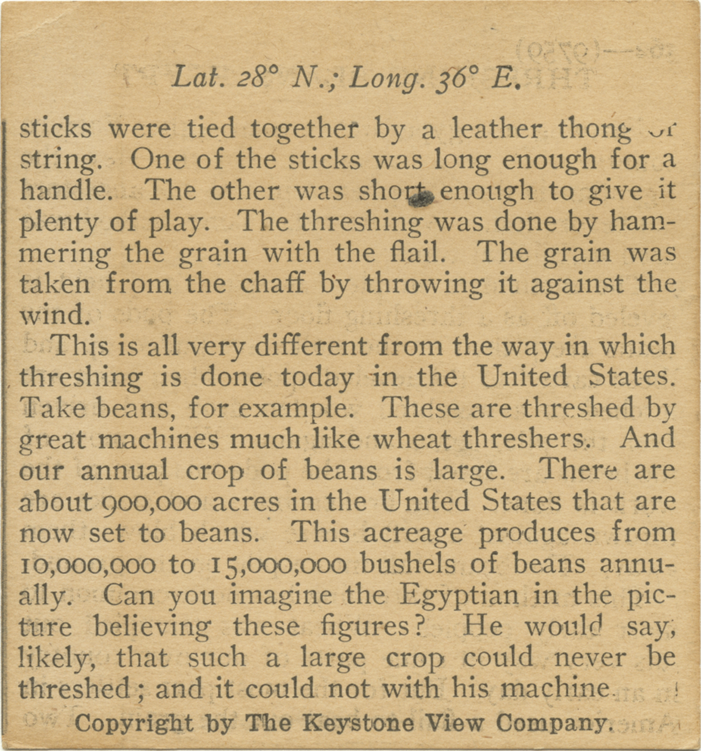 sticks were tied together by a leather thong of string. One of the sticks was long enough for a handle. The other was short enough to give it plenty of play. The threshing was done by hammering the grain with the flail. The grain was taken from the chaff by throwing it against the wind. This is all very different from the way in which threshing is done today in the United States. Take beans, for example. These are threshed by great machines much like wheat threshers. And our annual crop of beans is large. There are about 900,000 acres in the United States that are now set to beans. This acreage produces from 10,000,000 to 15,000,000 bushels of beans annually. Can you imagine the Egyptian in the picture believing these figures? He would say, likely, that such a large crop could never be threshed; and it could not with his machine.