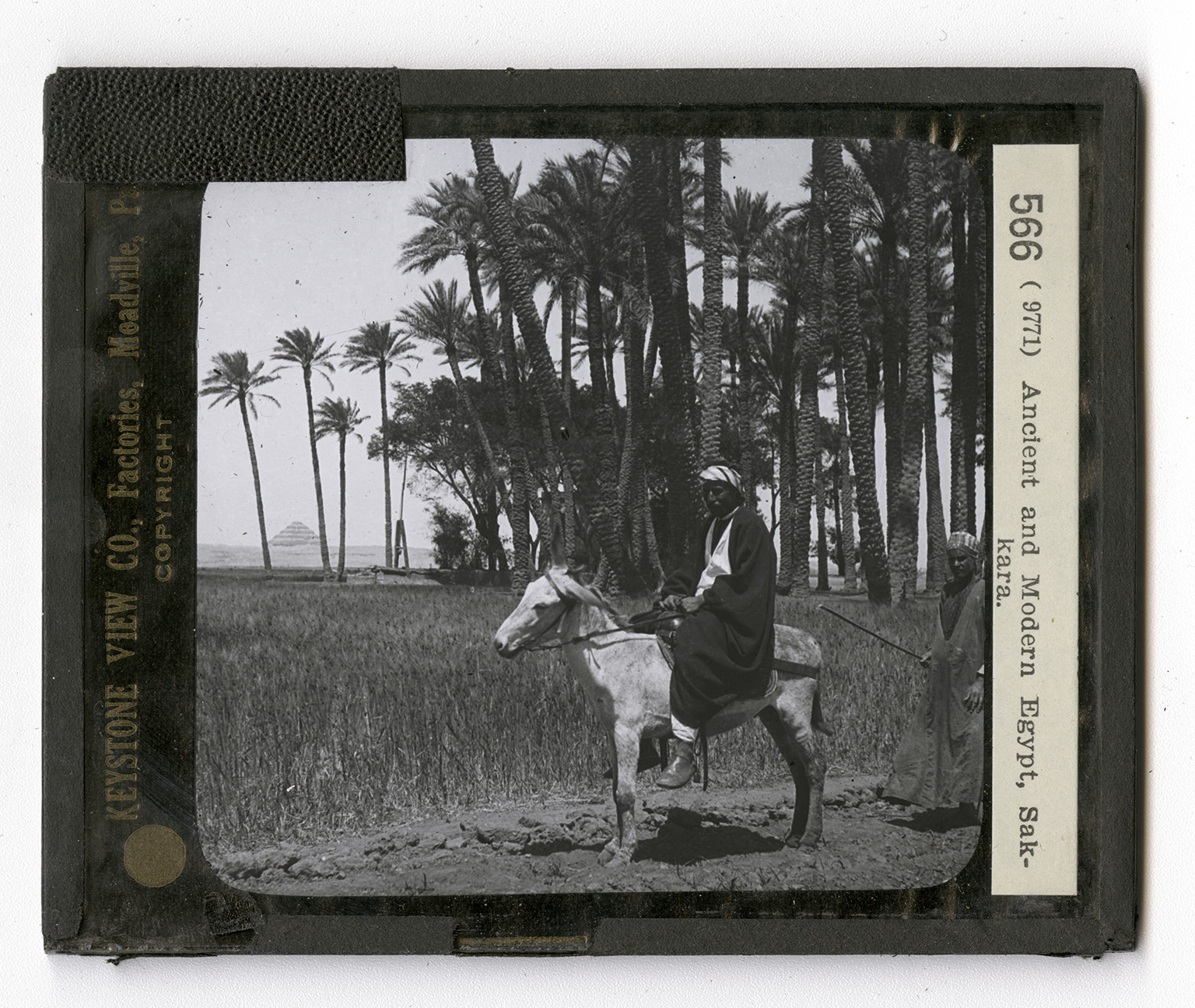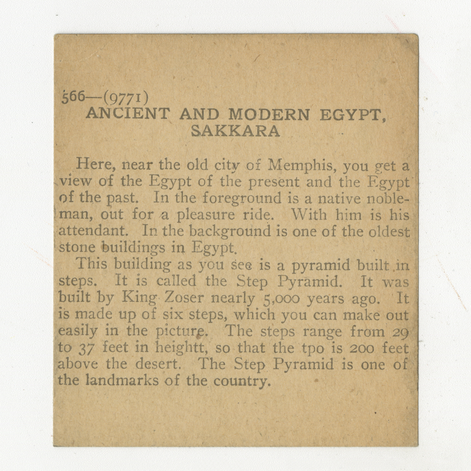 Here near the old city of Memphis, you get a view of Egypt of the present and the Egypt of the past. In the foreground is a native nobleman, out for a pleasure ride. With him is his attendant. In the background is one of the oldest stone buildings in Egypt. This building as you see is a pyramid built in steps. It is called the Step Pyramid. It was built by King Zoser nearly 5,000 years ago. It is made up of six steps, which you can make out easily in the picture. The steps range from 29 to 37 feet in heightt, so that the tpo is 200 feet above the desert. The Step Pyramid is one of the landmarks of the country.