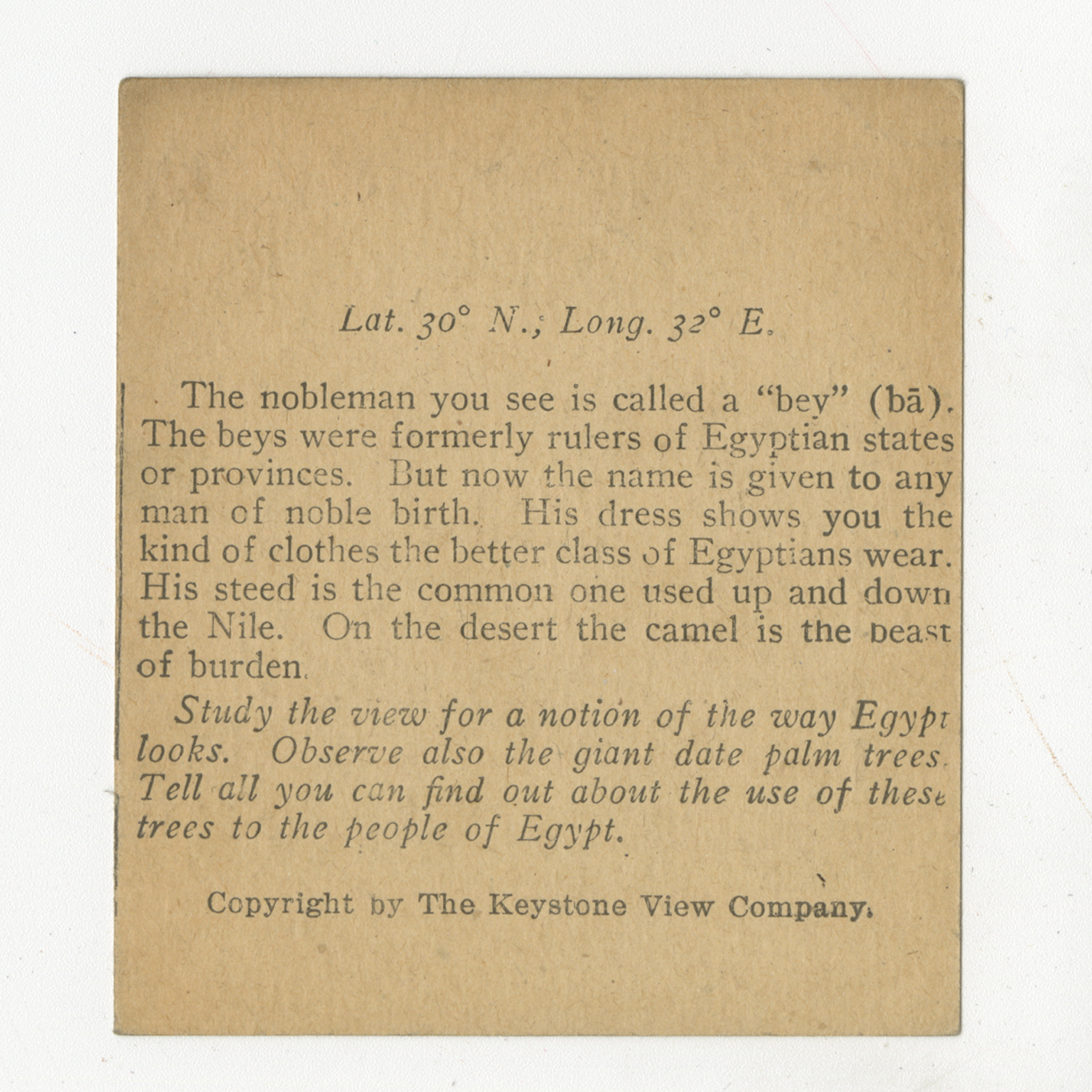 The nobleman you see is called a "bey". The beys were formelly rulers of Egyptian states or provinces. But now the name is given to any man of noble birth. His dress shows you the kind of clothes the better class of Egyptians wear. His steed is the common one used up and down the Nile. One the desert the camel is the beast of burden. Study the view for a nation of the way Egypt looks. Observe also the giant date palm trees. Tell all you can find out about the use of these trees to the people of Egypt.