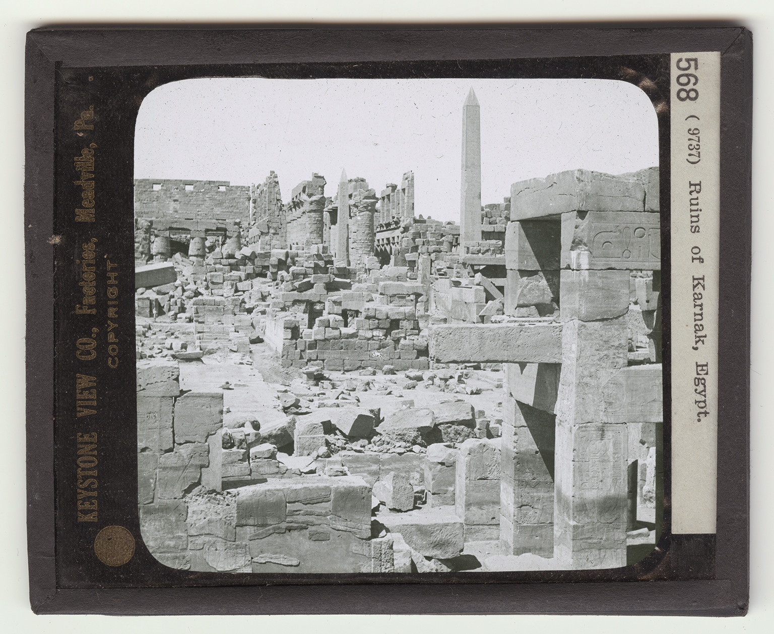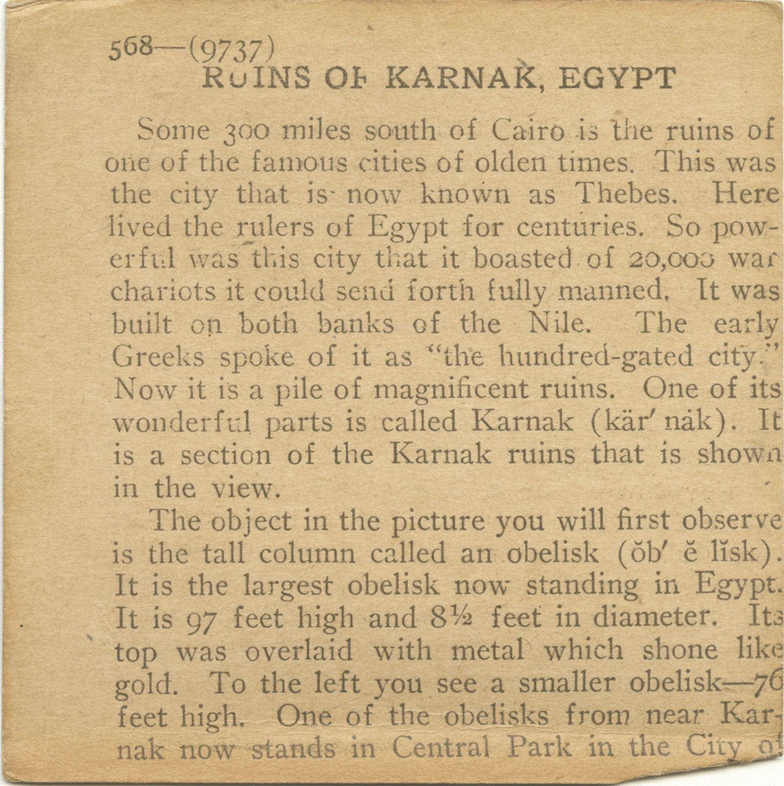 Some 300 miles south of Cairo is the ruins of one of the famous cities of olden times. This was the city that is now known as Thebes. Here lived the rulers of Egypt for centuries. So powerful was this city that is boasted of 20,000 war chariots it could send fourth fully mannered. It was built on both banks of the Nile. The early Greeks spoke of it as "the hundred-gated city." Now it is a pile of magnificent ruins. one of its wonderful parts is called Karnak. It is a section of the Karnak ruins that is shown in the view. The object in the picture you will first observe is the tall column called an obelisk. It is the largest obelisk now standing in Egypt. It is 97 feet high and 8 1/2 feet in diameter. Its top was overlaid with metal which shone like gold. To the left you see a smaller obelisk - 76 feet high. One of the obelisks from near Karnak now stands in Central Park in the City of