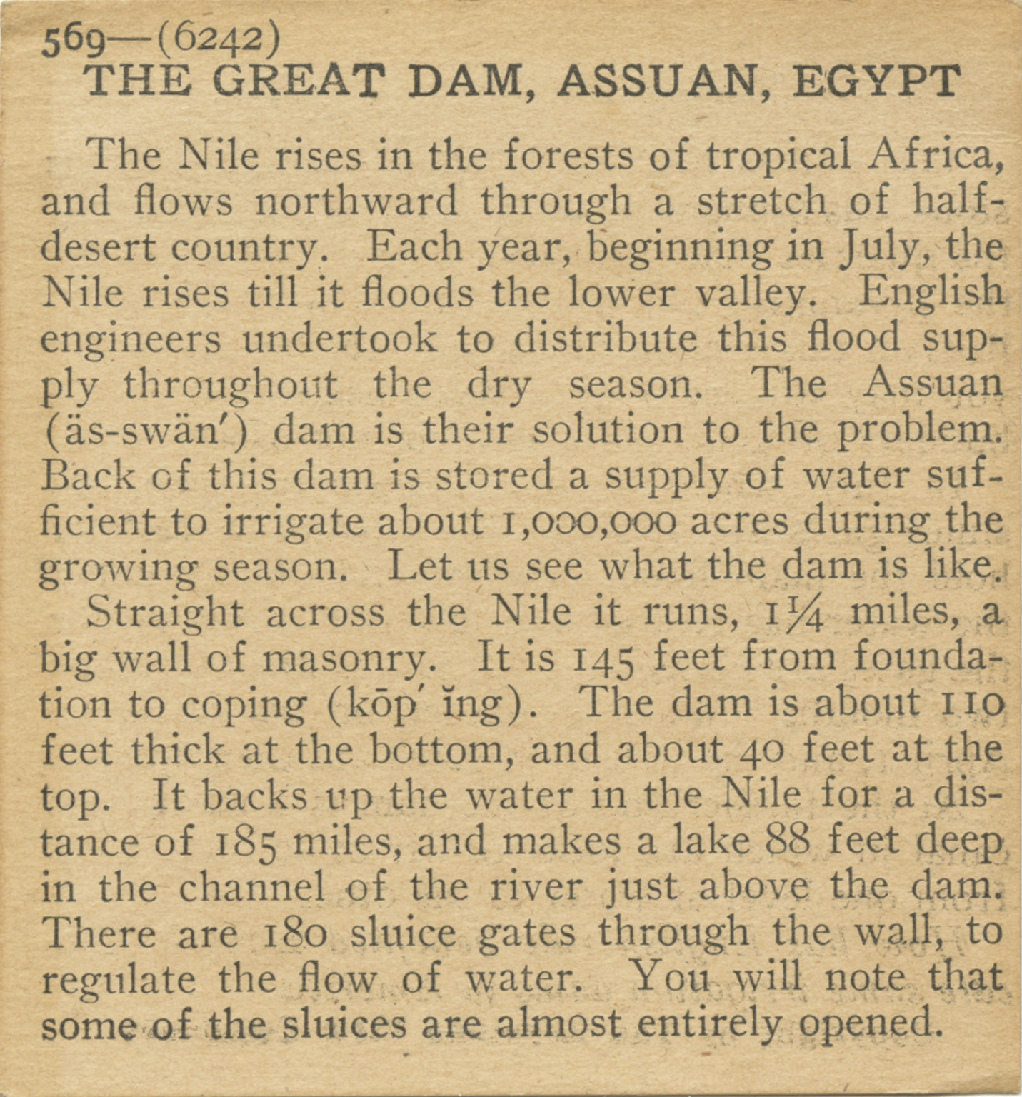 The Nile rises in the forests of tropical Africa, and flows northward through a stretch of half-desert country. Each year, beginning in July, the Nile rises till it floods the lower valley. English engineers undertook to distribute this flood supply throughout the dry season. The Assuan dam is their solution to the problem. Back of this dam is stored a supply of water sufficient to irrigate about 1,000,000 acres. during the growing season. Let us see what the dam is like. Straight across the Nile it runs, 1 1/4 miles, a big wall of masonry. It is 145 feet from foundation to coping. The dam is about 110 feet thick at the bottom, and about 40 feet at the top. It backs up the water in the Nile for a distance of 185 miles, and makes a lake 88 feet deep, in the channel of the river just above the dam. There are 180 sluice gates through the wall, to regulate the flow of the water. You will note that some of these sluices are almost entirely opened.