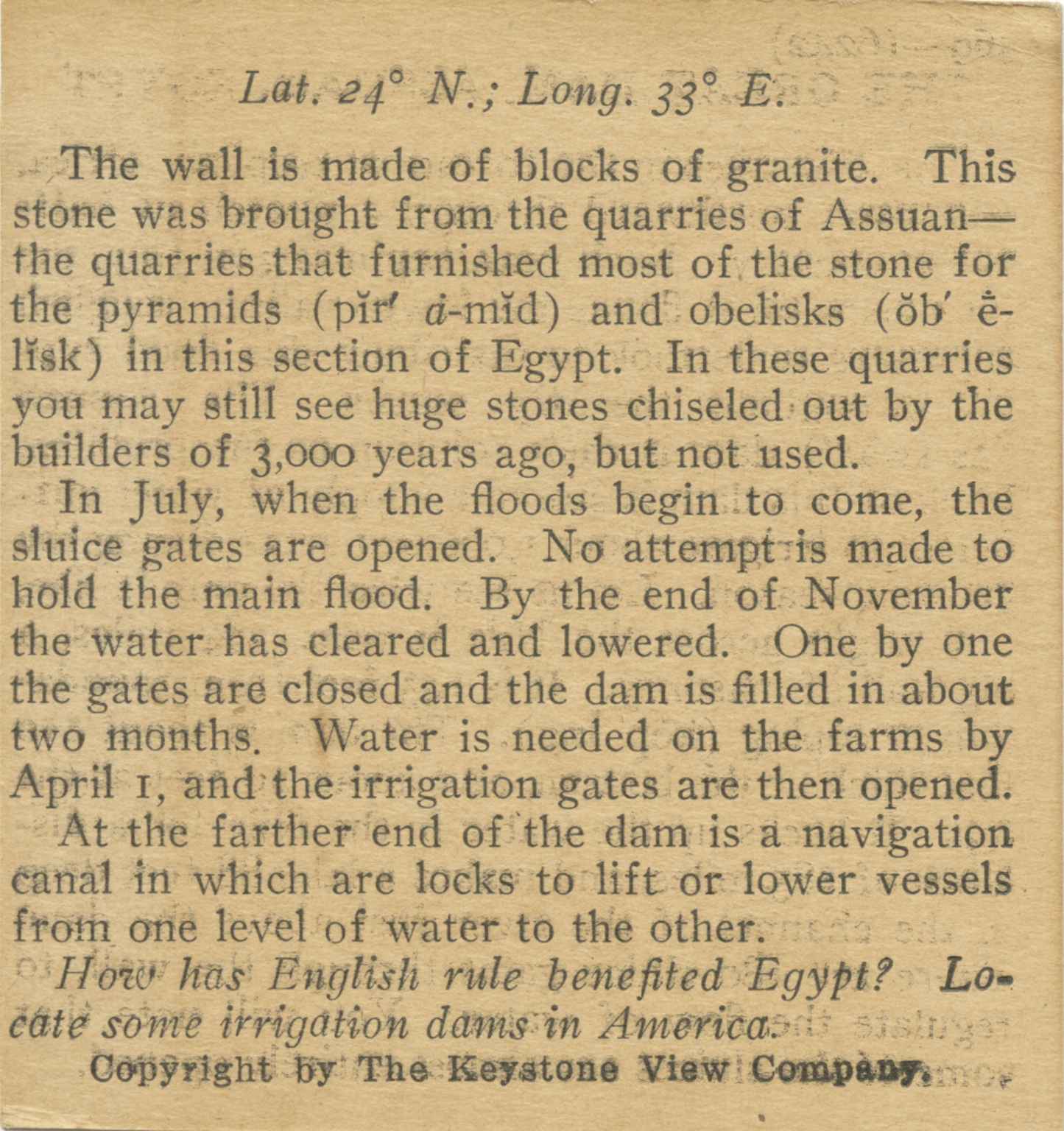 The wall is made of blocks of granite. This stone was brought from the quarries of Assuan- the quarries that furnished most of the stone for the pyramids and obelisks in this section of Egypt. In these quarries you may still see the huge stones chiseled out by the builders of 3,000 years ago, but not used. In July, when the floods begin to come, the sluice gates are opened. No attempt is made to hold the main flood. By the end of November the water has cleared and lowered. One by one the gates are closed and the dam is filled in about two months. Water is needed on the famrs by April 1, and the irrigation gates are then opened. At the farther end of the dam is a navigation canal in which are locks to lift or lower vessels from one level of water to the other. How has English rule benefited Egypt? Locate some irrigation dams in America.