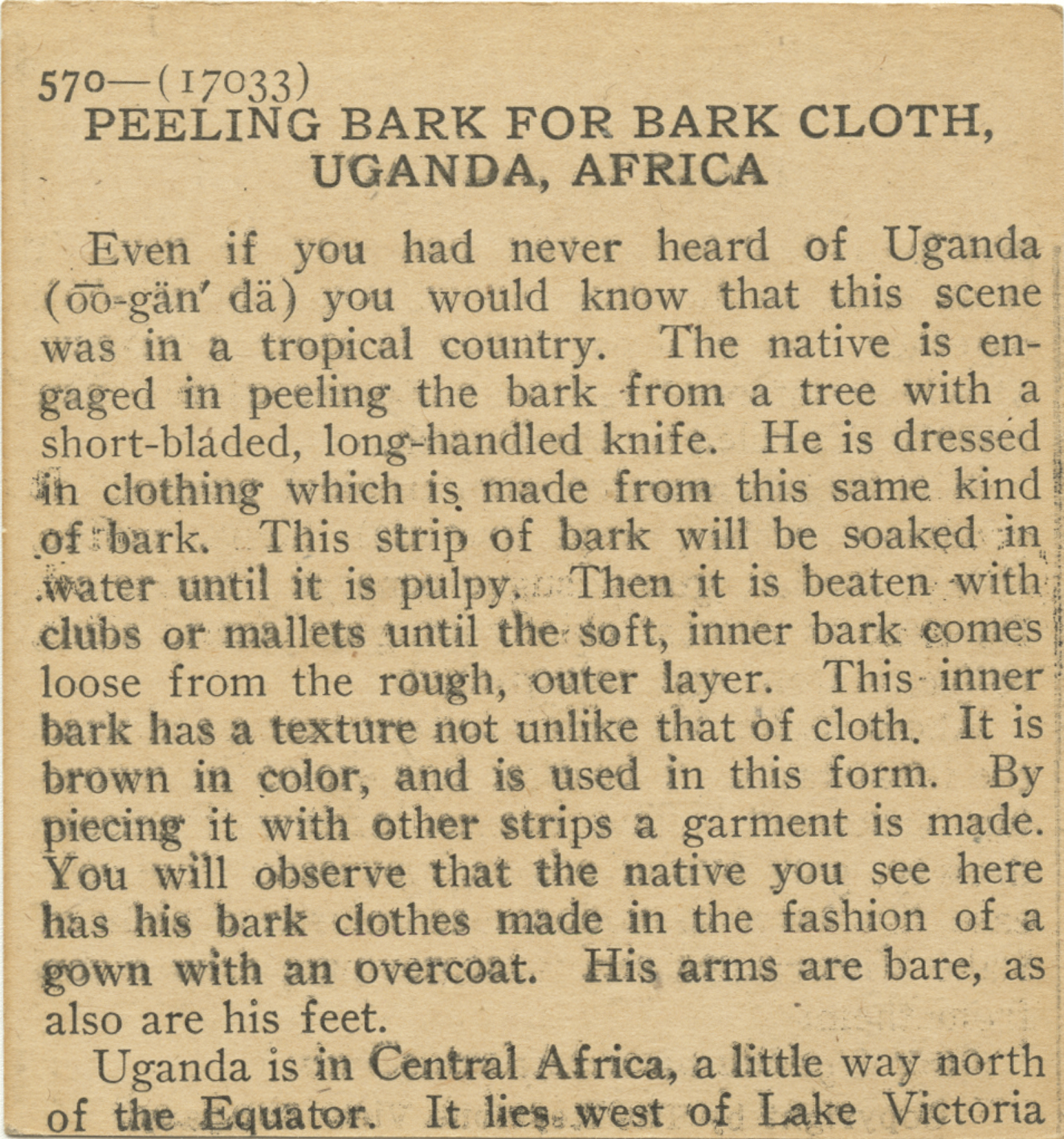 Even if you had never heard of Uganda you would know that this scene was in a tropical country. The native is engaged in peeling the bark from a tree with a short-bladed, long-handled knife. He is dressed in clothing which is made from this same kind of bark. This strip of bark will be soaked in water until it is pulpy. Then it is beaten with clubs or mallets until the soft, inner bark comes loose from the rough, outer layer. This inner bark has a texture not unlike that of cloth. It is brown in color, and is used in this form. By piecing it with other strips a garment is made. You will observe that the native you see here has his bark clothes made in the fashion of a gown with an overcoat. His arms are bare, as also are his feet. Uganda is in Central Africa, a little way north of the Equator. It lies west of Lake Victoria
