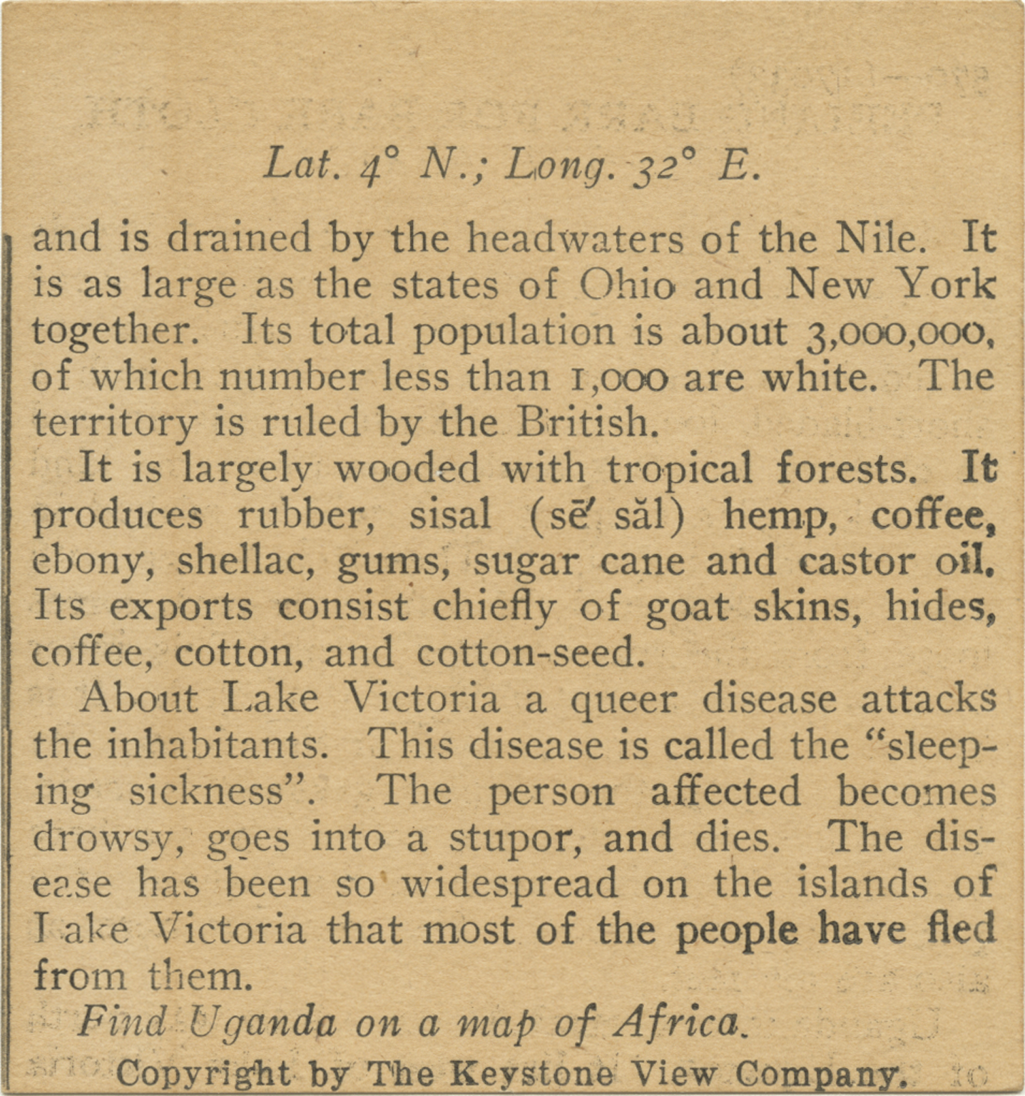 and is drained by the headwaters of the Nile. It is as large as the states of Ohio and New York together. Its total population is about 3,000,000 of which number less than 1,000 are white. The territory is ruled by the British. It is largely wooded with tropical forests. It produces rubber, sisal hemp, coffee, ebony, shellac, gums, sugar cane and castor oil. Its exports consist chiefly of goat skins, hides, coffee, cotton, and cotton-seed. About Lake Victoria a queer disease attacks the inhabitants. This disease is called the "sleeping sickness". The person affected becomes drowsy, goes into a stupor, and dies. The disease has been so widespread on the islands of Lake Victoria that most of the people have fled from them. Find Uganda on a map of Africa.