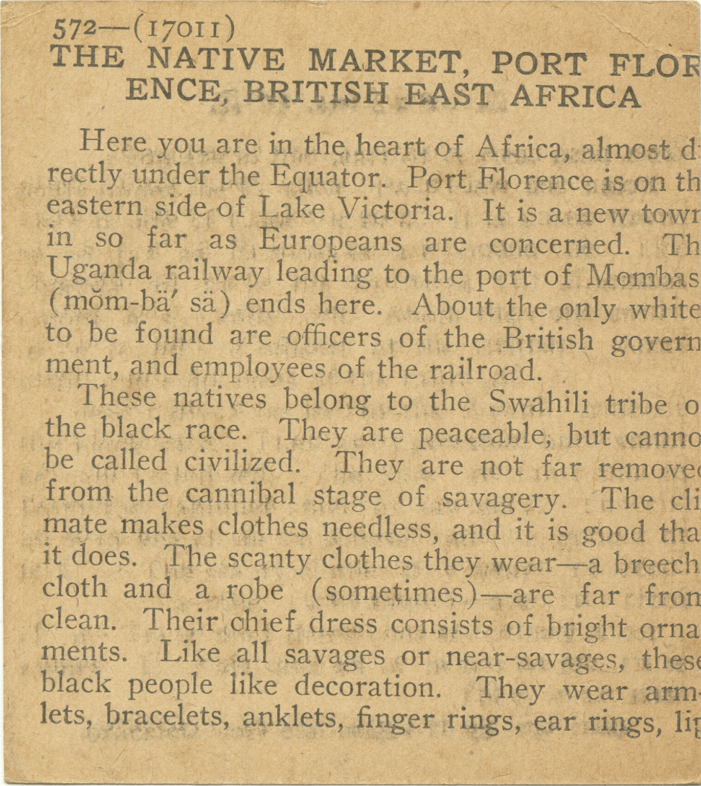 Here you are in the heart of Africa, almost directly under the Equator. Port Florence is on the eastern side of Lake Victoria. It is a new town, in so far as Europeans are concerned. The Uganda railway leading to the port of Mombasa ends here. About the only whites to be found are officers of the British government, and employees of the railroad. These natives belong to the Swahili tribe of the black race. They are peaceable, but cannot be called civilized. They are not far removed from the cannibal state of savagery. The climate makes clothes needless, and it is good that it dies. The scanty clothes they wear - a breechcloth and a robe (sometimes) - are far from clean. Their chief dress consists of bright ornaments. Like all savages or near-savages, these black people like decoration. They wear armlets, bracelets, anklets, finger rings, ear rings, lip