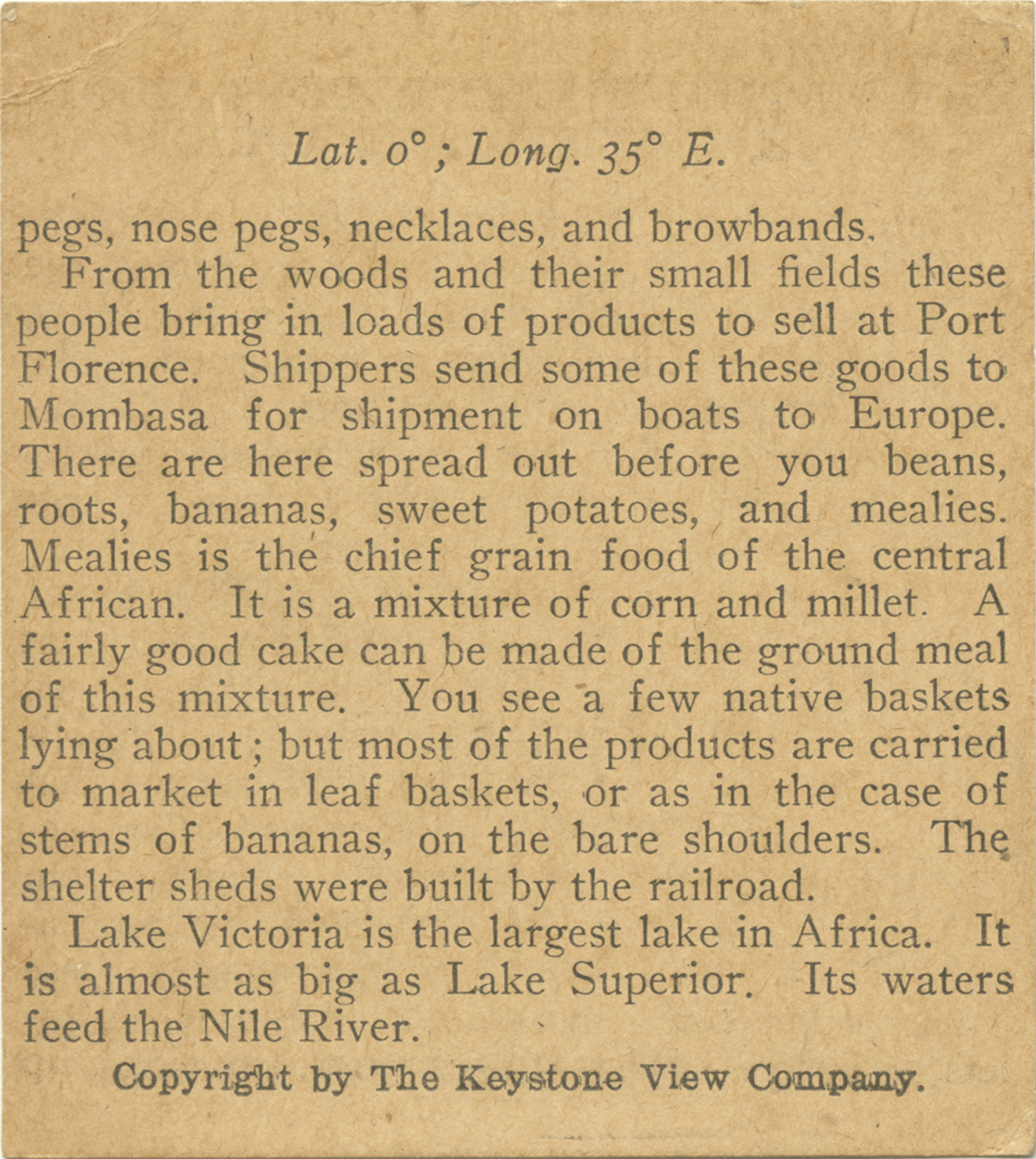 pegs, nose pegs, necklaces, and browbands. From the woods and their small fields these people bring in loads of products to sell at Port Florence. Shippers send some of these goods to Mombasa for shipment on boats to Europe. There are here spread out before you beans, roots, bananas, sweet potatoes, and mealies. Mealies is the chief grain food of the central African. It is a mixture of corn and millet. A fairly good cake can be made of the ground meal of this mixture. You see a few native baskets lying about; but most of the products are carried to the market in leaf baskets, or as in the case of stems of bananas, on the bare shoulders. The shelter sheds were built by railroad. Lake Victoria is the largest lake in Africa. It is almost as big as Lake Superior. Its waters feed the Nile River.