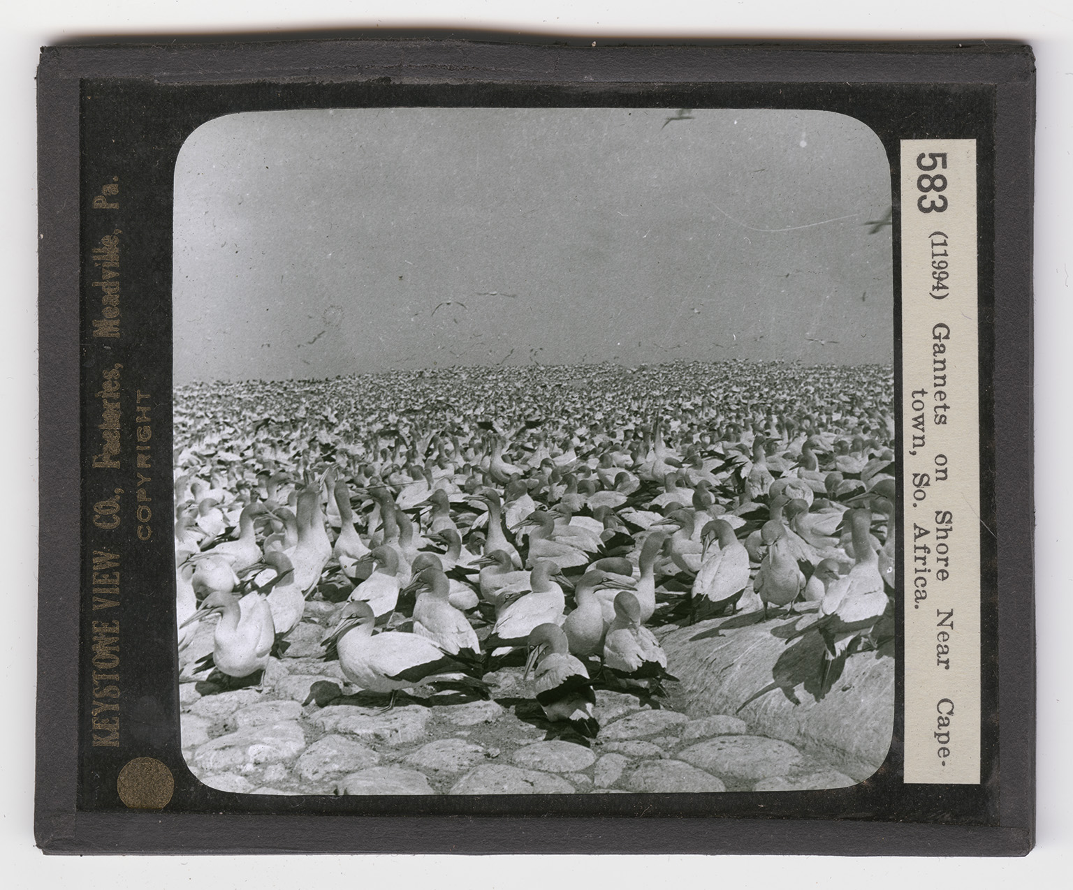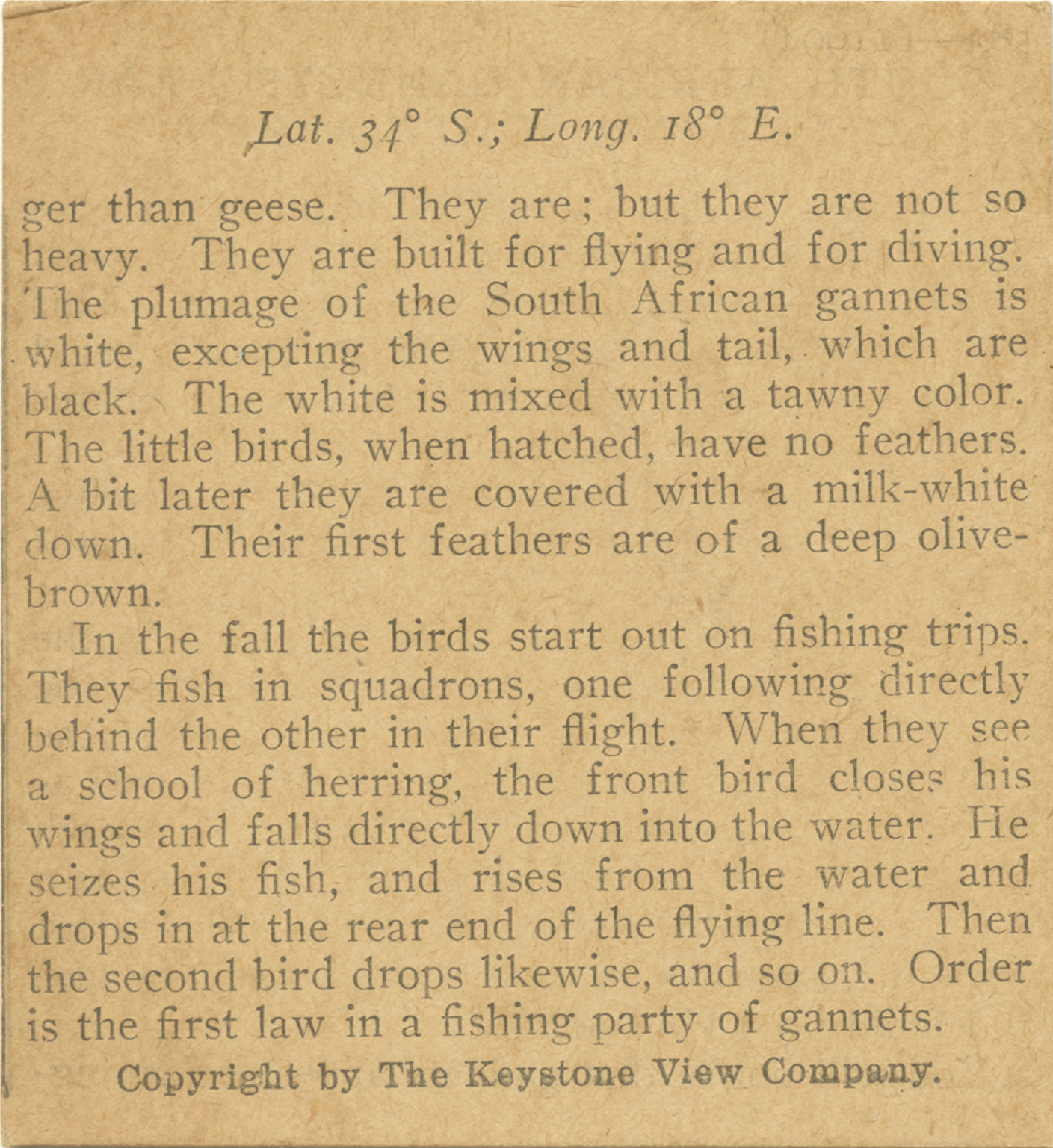 A glance at this scene might lead one to believe that he was looking over a lake with short waves chopping each other into whitecaps. This is only a small section of a great breeding ground of sea birds called gannets, on the south shores of Africa. Gannets are a king of wild geese. They live in colder waters also, in both northern and southern latitudes. Off the British Isles they have 4 or 5 stations which they visit regularly. In the northern latitudes, these birds come about the first of April and leave in the fall when the young birds are ready to fly. On such ground as you see here they lay their eggs and hatch them. The mother birds lay one egg apiece, in a hollow place in the sand or among the rocks. Or they may bring sea weed from a long distance and builf up a kind of nest. You will notice that the gannets appear to be big-