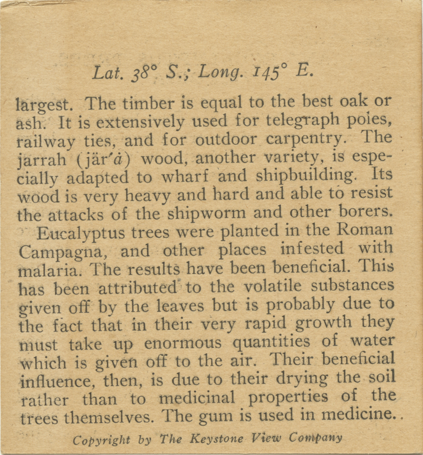 largest. The timber is equal to the best oak or ash. It is extensively used for telegraph poles, railway ties, and for outdoor carpentry. The jarrah wood, another variety, is especially adapted to wharf and shipbuilding. Its wood is very heavy and hard and able to resist the attacks of the shipworm and other borers. Eucalyptus trees were planted by the Romans in Campagna, and other places infested with malaria. The results have been beneficial. This has been attributed to the volatile substances given off by the leaves but is probably due to the fact that in their very rapid growth they must take up enormous quantities of water which is given off to the air, Their beneficial influence, then, is due to their drying the soil rather than to medicinal properties of the trees themselves. The gum is used in medicine.