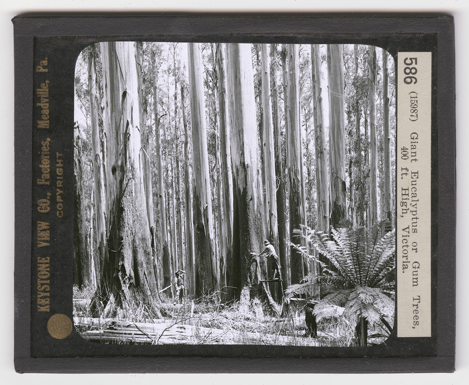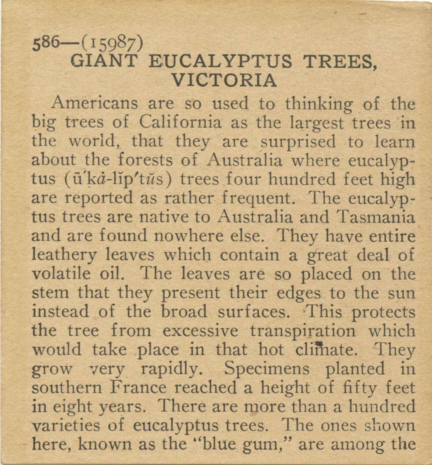 Americans are so used to thinking of the big trees of California as the largest trees in the world, that they are surprised to learn about the forests of Australia where eucalyptus trees four hundred feet high are reported as rather frequent. The eucalyptus trees are native to Australia and Tasmania and are found nowhere else. They have entire leathery leaves which contain a great deal of volatile oil. The leaves are so placed on the stem that they present their edges to the sun instead of the broad surfaces. This protects the tree from excessive transpiration which would take place in that hot climate. They grow very rapidly. Specimens planted in southern France reached a height of fifty feet in eight years. There are more than a hundred varieties of eucalyptus trees. The ones shown here, known as the "blue gum", are among the