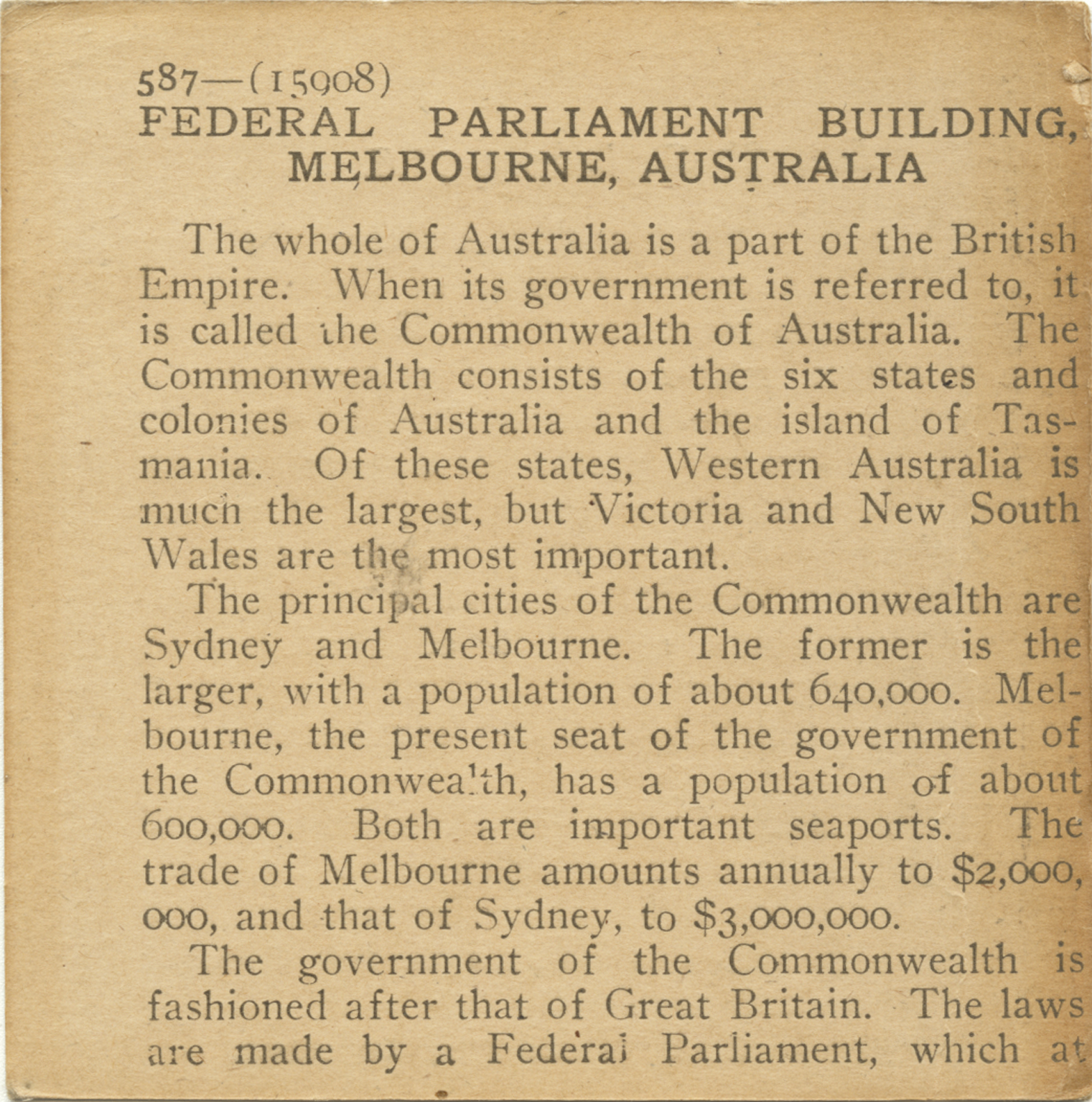 The whole of Australia is a part of the British Empire. When its government is referred to, it is called the Commonwealth of Australia. The Commonwealth consists of the six states and colonies of Australia and the island of Tasmania. Of these states, Western Australia is much the largest, but Victoria and New South Wales are the most important. The principal cities of the Commonwealth are Sydney and Melbourne. The former is the larger, with a population of about 640,000. Melbourne, the present seat of the government of the Commonwealth, has a population of about 600,000. Both are important seaports. The trade of Melbourne amounts annually do $2,000,000, and that of Sydney, to $3,000,000. The goverment of the Commonwealth is fashioned after that of Great Britain. The laws are made by a Federal Parliament, which at