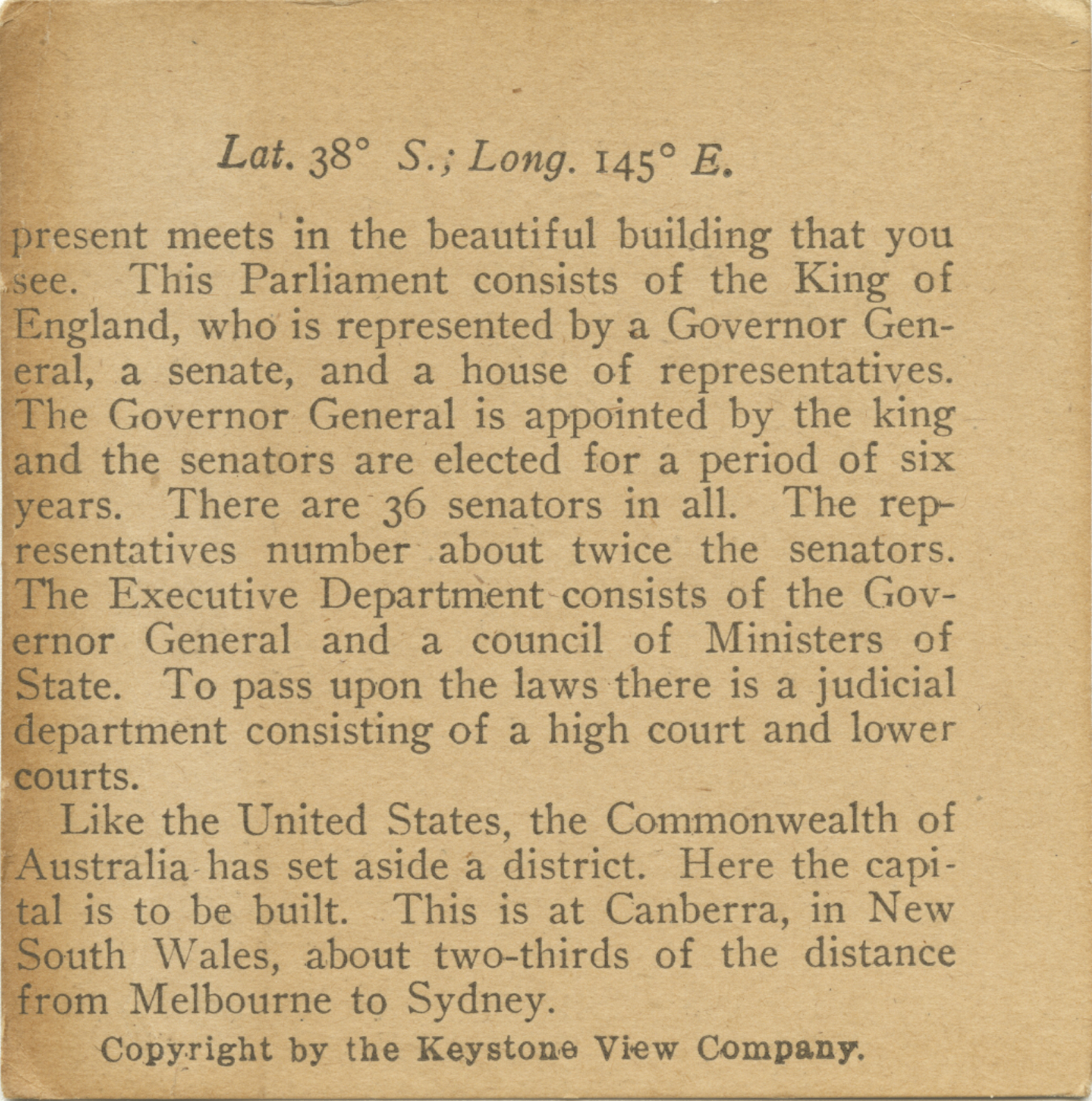 present meets in the beautiful building that you see. This Parliament consits of the King of England, who is represented by a Governor General, a senate, and a house of representatives. The Governor General is appointed by the king and the senators are elected for a period of six years. There are 36 senators in all. The representatives number about twice the senators. The Executive Department consists of Ministers of State. To pass upon the laws there is a judicial department consisting of a high court and lower courts. Like the United States, the Commonwealth of Australia has set aside a district. Here the capital is to be built. This is at Canberra, in New South Wales, about two-thirds of the distance from Melbourne to Sydney.