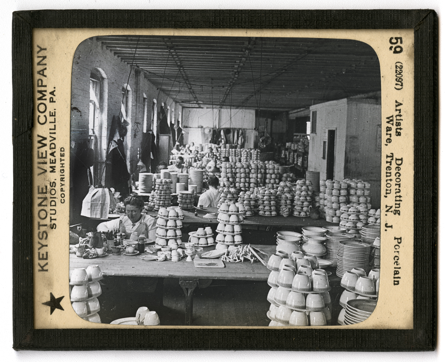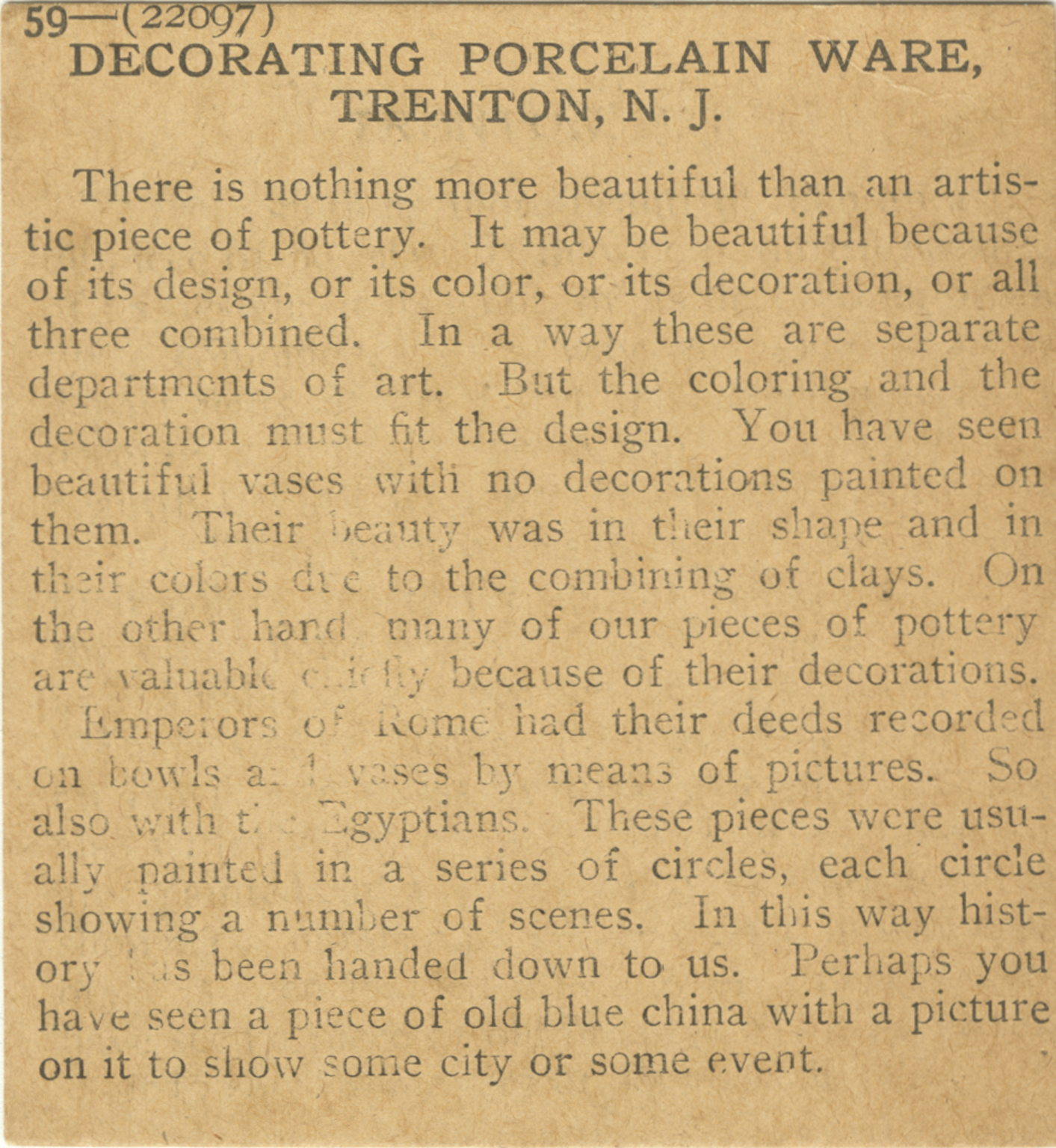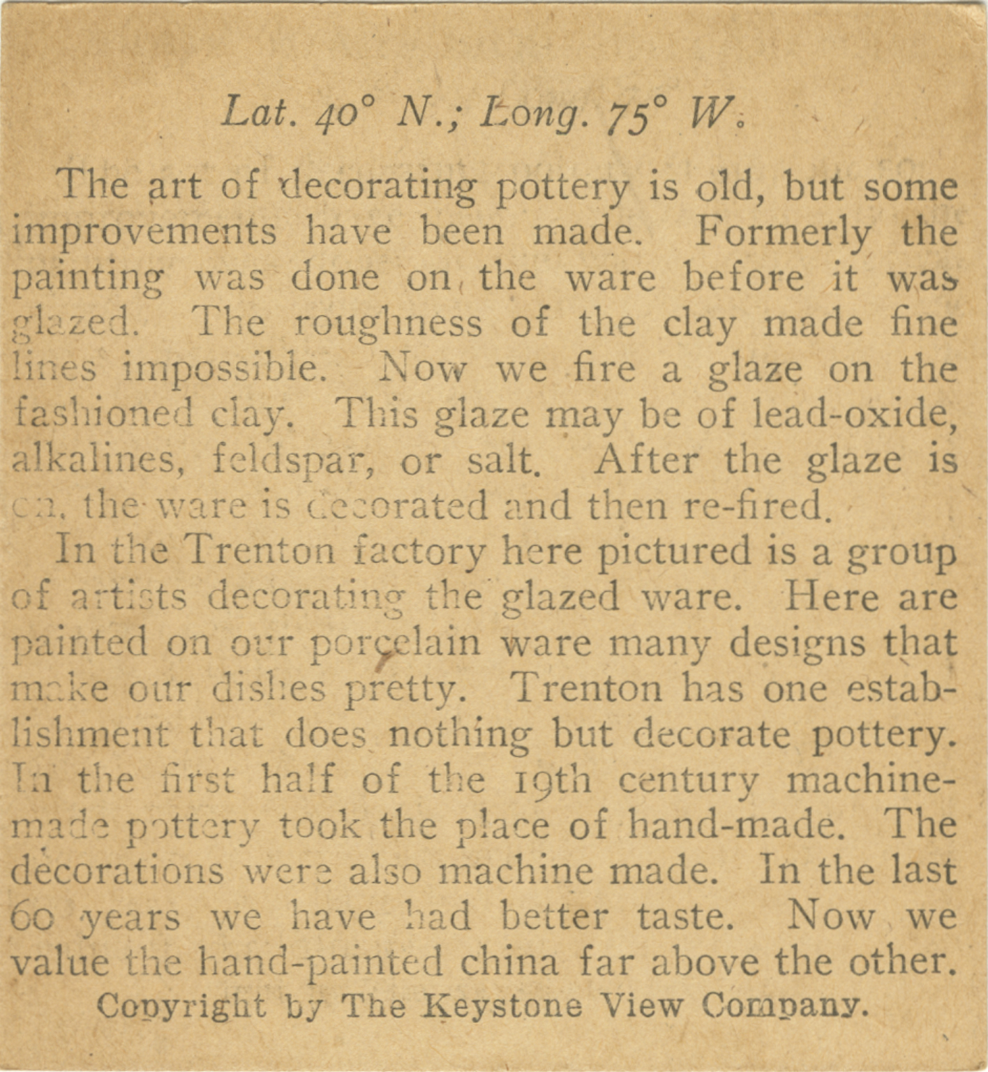 The art of decorating pottery is old, but some improvements have been made. Formerly the painting was done on the ware before it was glazed. The roughness of the clay made fine lines impossible. Now we fire a glaze on the fashioned clay. This glaze may be of lead-oxide, alkalines, feldspar, or salt. After the glaze is on the ware is decorated and then re-fired. In the Trenton factory here pictured is a group of artists decorating the glazed ware. Here are painting on our porcelain ware many designs that make our dishes pretty. Trenton has one establishment that does nothing but decorate pottery. In the first half of the 19th century machine-made pottery took the place of the hand-made. The decorations were also machine made. In the last 60 years we have had better taste. Now we value the hand-painted china far above the other.