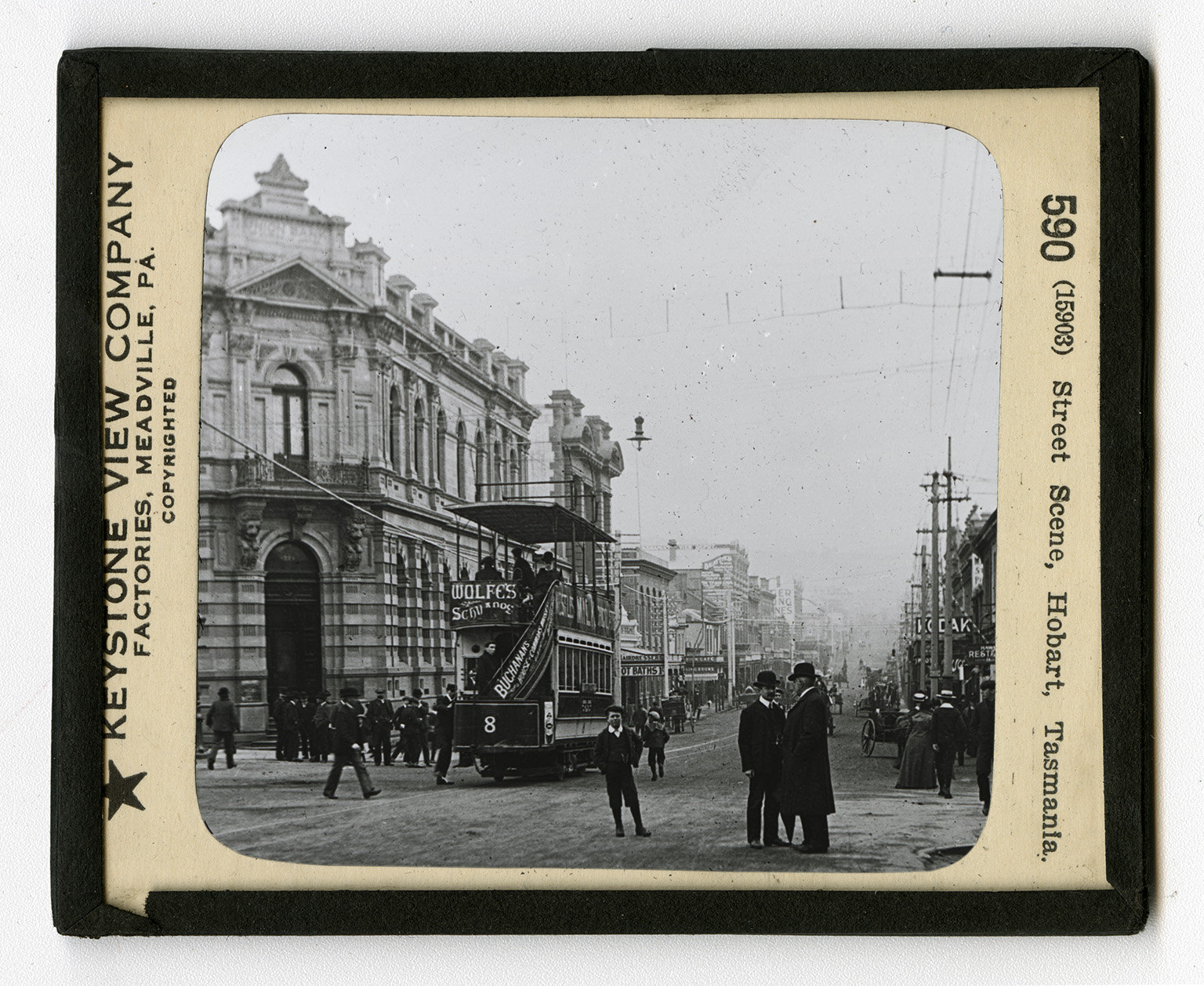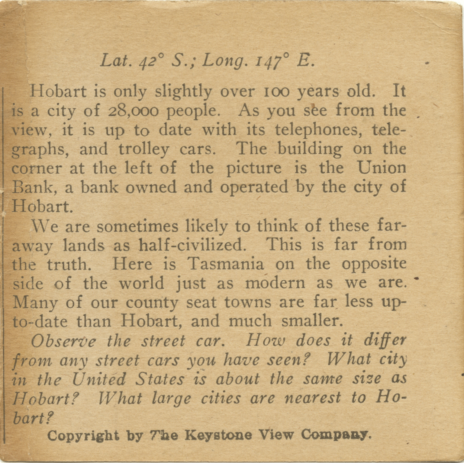 Hobart is only slightly over 100 years old. It is a city of 28,000 people. As you see from the view, it is up to date with its telephones, telegraphs, and trolley cars. The building on the corner at the left of the picture is the Union Bank, a bank owned and operated by the city of Hobart. We are sometimes likely to think of these faraway lands as half-civilized. This is far from the truth. Here is Tasmania on the opposite side of the world just as modern as we are. Many of our county seat towns are far less up-to-date than Hobart, and much smaller. Observe the street car. How does it differ from any street cars you have seen? What city in the United States is about the same size as Hobart? What large citites are nearest to Hobart?
