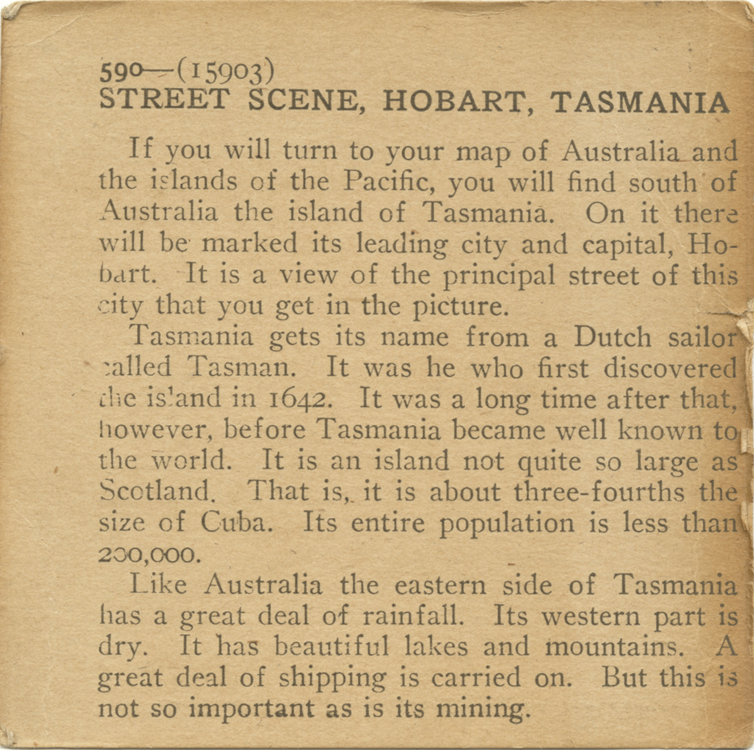If you will turn to your map of Australia and the islands of the Pacific, you will find south of Australia the island of Tasmania. On it there will be marked its leading city and capital, Hobart. It is a view of the principal street of this city that you get in the picture. Tasmania gets its name from a Dutch sailor called Tasman. It was he who first discovered the island in 1642. It was a long time after that, however, before Tasmania became well known to the world. It is an island not quite so large as Scotland. That is, it is about three-fourths the size of Cuba. Its entire population is less than 200,000. Like Australia the eastern side of Tasmania has a great deal of rainfall. Its western part is dry. It has beautiful lakes and mountains. A great deal of shipping is carried on. But this is not so important as its mining.