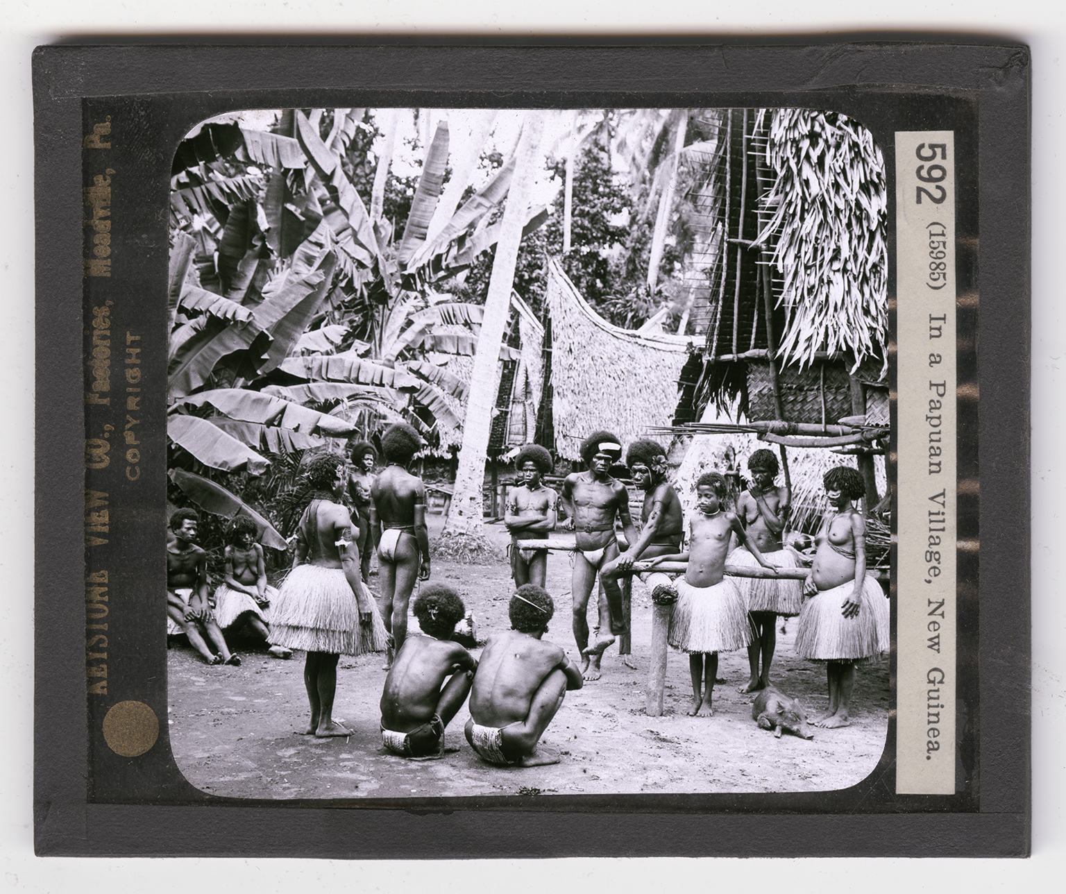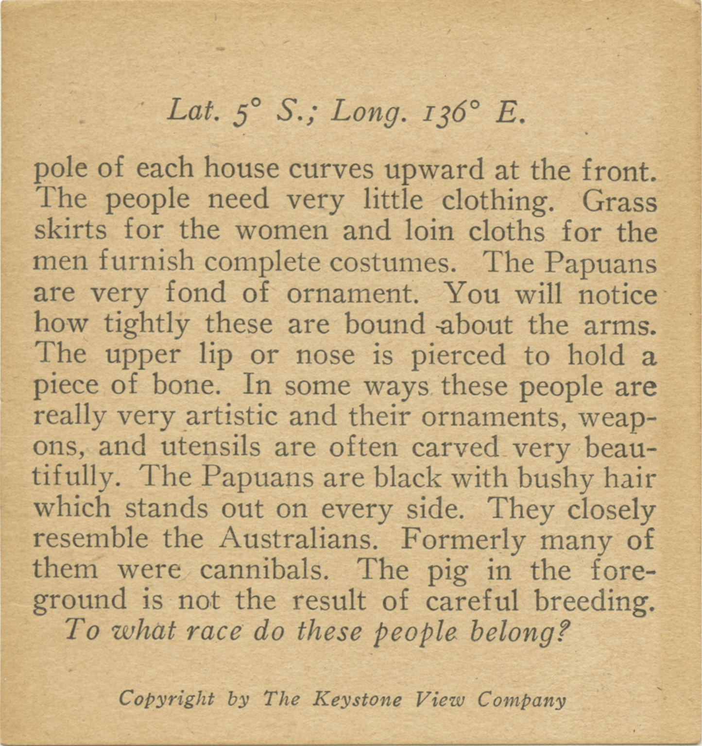 pole of each house curves upward at the front. The people need very little clothing. Grass skirts for the women and loin cloths for the men furnish complete costumes. The Papuans are very fond of ornament. You will notice how tightly these are bound about the arms. The upper lip or nose is pierced to hold a really very artistic in their ornaments, weapons, and utensils are often carved very beautifully. The Papuans are black with bushy hair which stands out on every side. They closely resemble the Australians. Formely many of them were cannibals. The pig in the foreground is not the result of careful breeding. To what race do these people belong?
