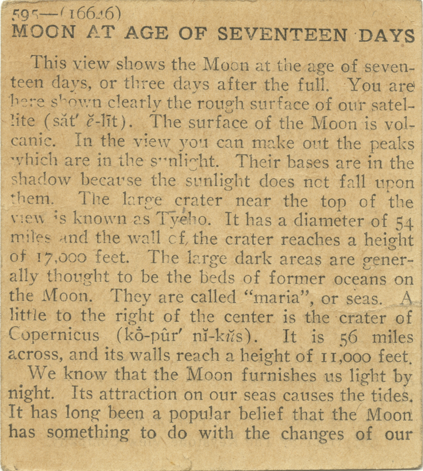 This view shows the Moon at the age of seventeen days, or three days after the full. You are here shown clearly the rough surface of our satelite. The surface of the Moon is volcanic. In the view you can make out the peaks which are in the sunlight. Their bases are in the shadow because the sunlight does not fall upon them. The large crater near the top of the view is know as Tyeho. It has a diameter of 54 miles and the wall of the crater reaches a height of 17,000 feet. The large dark areas are generally thought to be the beds of former oceans on the Moon. They are called "maria", or seas. A little to the right of the center is the crater of Copernicus. It is 56 miles across, and its walls reach a height of 11,000 feet. We know that the Moon furnishes us light by night. Its attraction on our seas causes the tides. It has long been a popular belief that the Moon has something to do with the changes of our