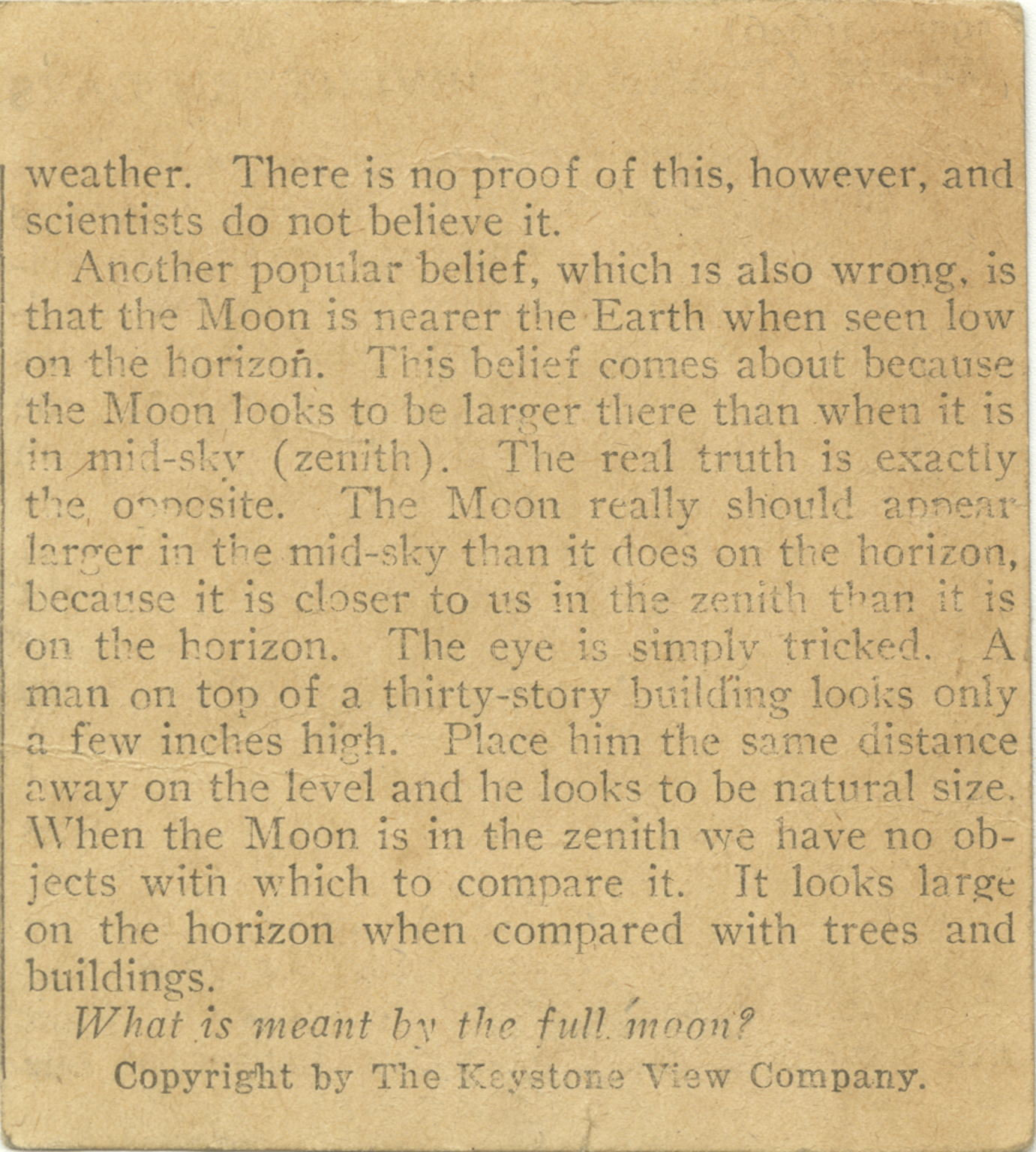 weather. There is no proof of this, however, and scientists do not believe it. Another popular belief, which is also wrong, is that the Moon is nearer the Earth when seen low on the horizon. This belief comes about because the Moon looks to be larger than when it is in mid-sky (zenith). The real truth is exactly the opposite. The Moon really should appear larger in the mid-sky than it does on the horizon, because it it closer to us in the zenith than it is on the horizon. The eye is simply tricked. A man on top of a thirty-story building looks only a few inches in height. Place him the same distance away on the level and he looks to be natural size. When the Moon is in the zenith we have no objects with which to compare it. It looks largest on the horizon when compared with trees and buildings. What is meant by the full moon?