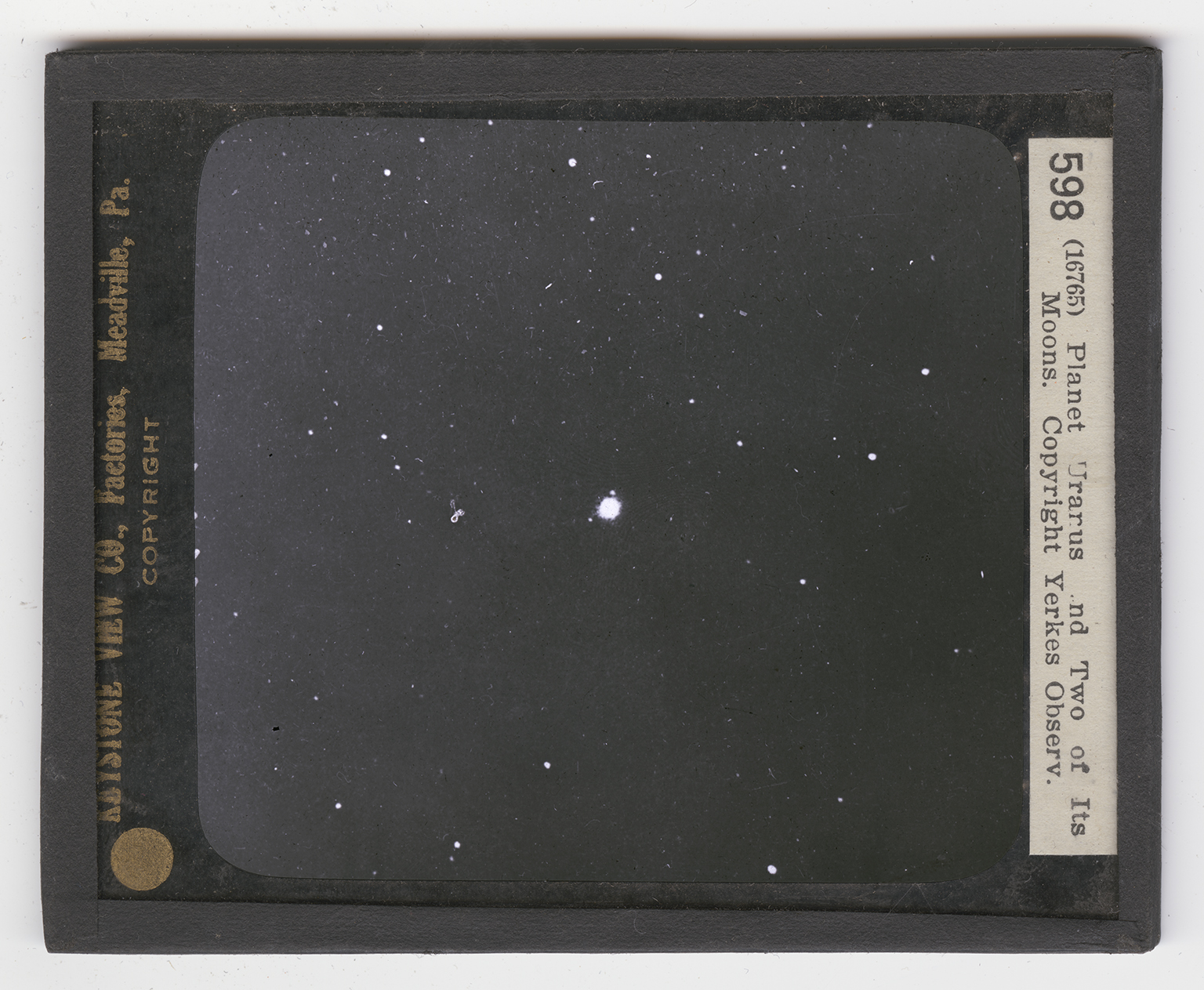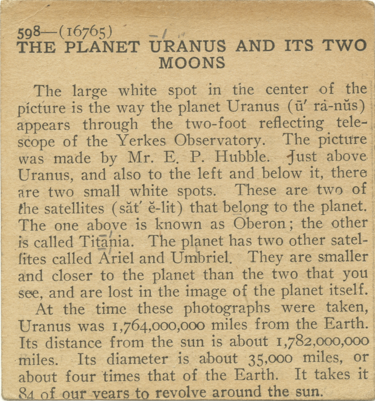The large white spot in the center of the picture is the way the planet Uranus appears through the two-foot reflecting telescope of the Yerkes Observatory. The picture was made by Mr. E. P. Hubble. Just above Uranus, and also to the left and below it, there are two small white spots. These are two of the satellites that beling to the planet. The one above is known as Oberon; the other is called Titania. The planet has two other satelites called Ariel and Umbriel. They are smaller and closer to the planet than the two that you see, and are lost in the image of the planet itself. At the time these photographs were taken, Uranus was 1,764,000,000 miles from the Earth. Its distance from the sun is about 1,782,000,000 miles. Its diameter is about 35,000 miles, or about four times that of the Earth. It takes it 84 of our years to revolve around the sun.