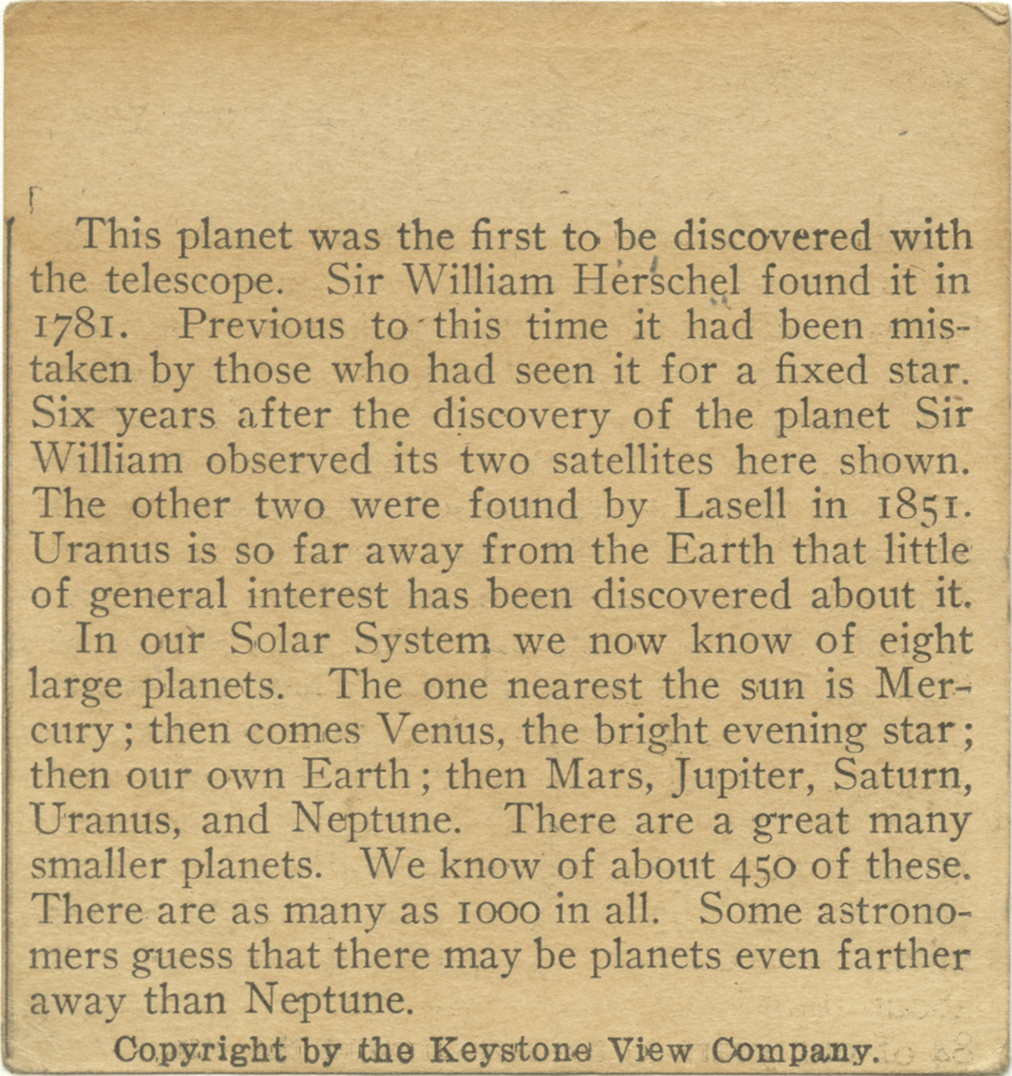 This planet was the first to be discovered with the telescope. Sir William Herschel found it in 1781. Previous to this time it has been mistaken by those who had seen it for a fixed star. Six years after the discovery of the planet Sir William observed its two satellites here shown. The other two were found by Lasell in 1851. Uranus is so far away from the Earth that little of general interst has been discovered about it. In our Solar System we now know of eight large planets. The one nearest the sun is Mercury; then comes Venus, the bright evening star; then our own Earth; then Mars, Jupiter, Saturn, Uranus, Neptune. There are a great many smaller planets. We know of about 450 of these. There are as many as 1000 in all. Some astronomers guess that there may be planets even farther away than Neptune.
