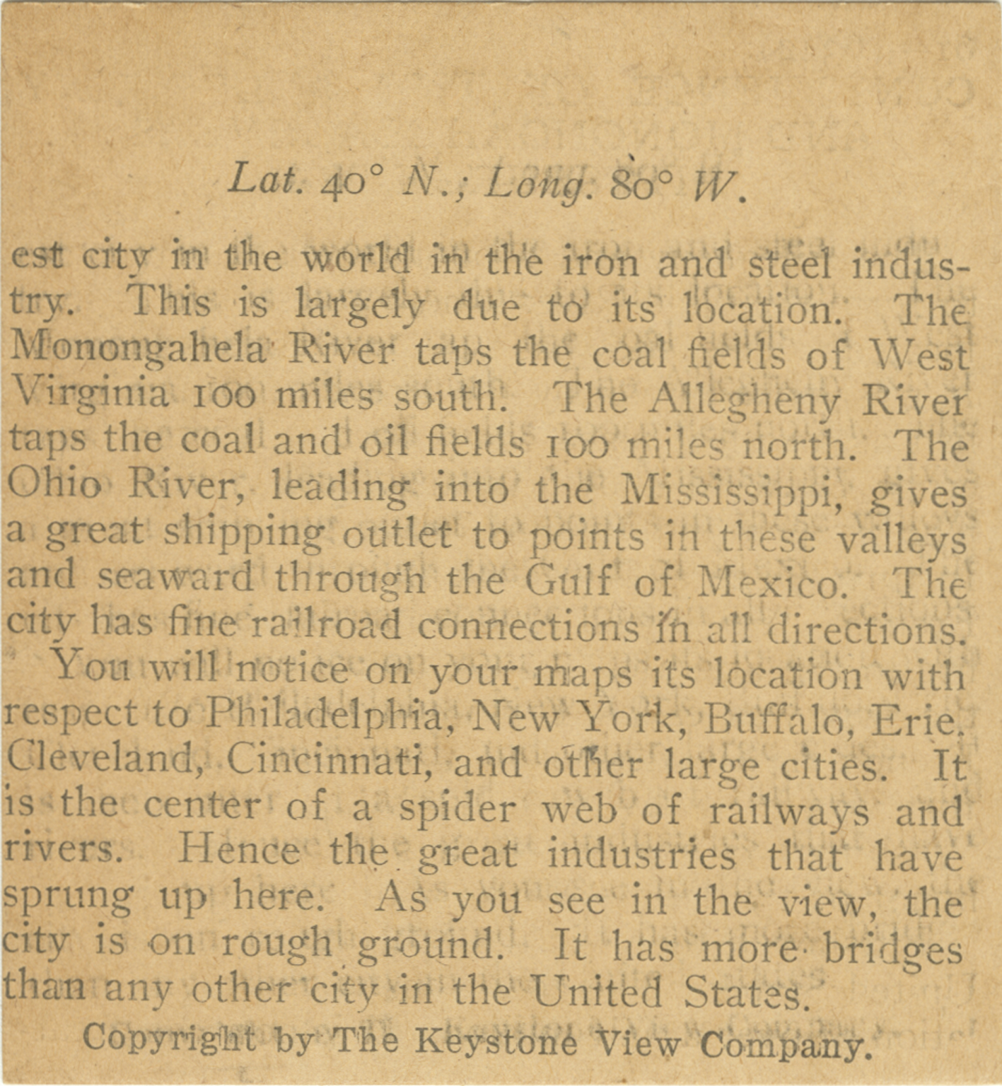 est city in the world in the iron and steel industry. This is largely due to its location. The Monongahela River taps the coal fields of West Virginia 100 miles south. The Allegheny River taps the coal and oil fields 100 miles north. The Ohio River, leading into the Mississippi, gives a great shipping outlet to points in these valleys and seaward through the Gulf of Mexico. The city has fine railroad connections in all directions. You will notice on your maps its location with respect to Philadelphia, New York, Buffalo, Erie, Cleveland, Cincinnati, and other large cities. It is the center of a spider web of railways and rivers. Hence the great industries that have sprung up here. As you see in the view, the city is on rough ground. It has more bridges than any other city in the United States.