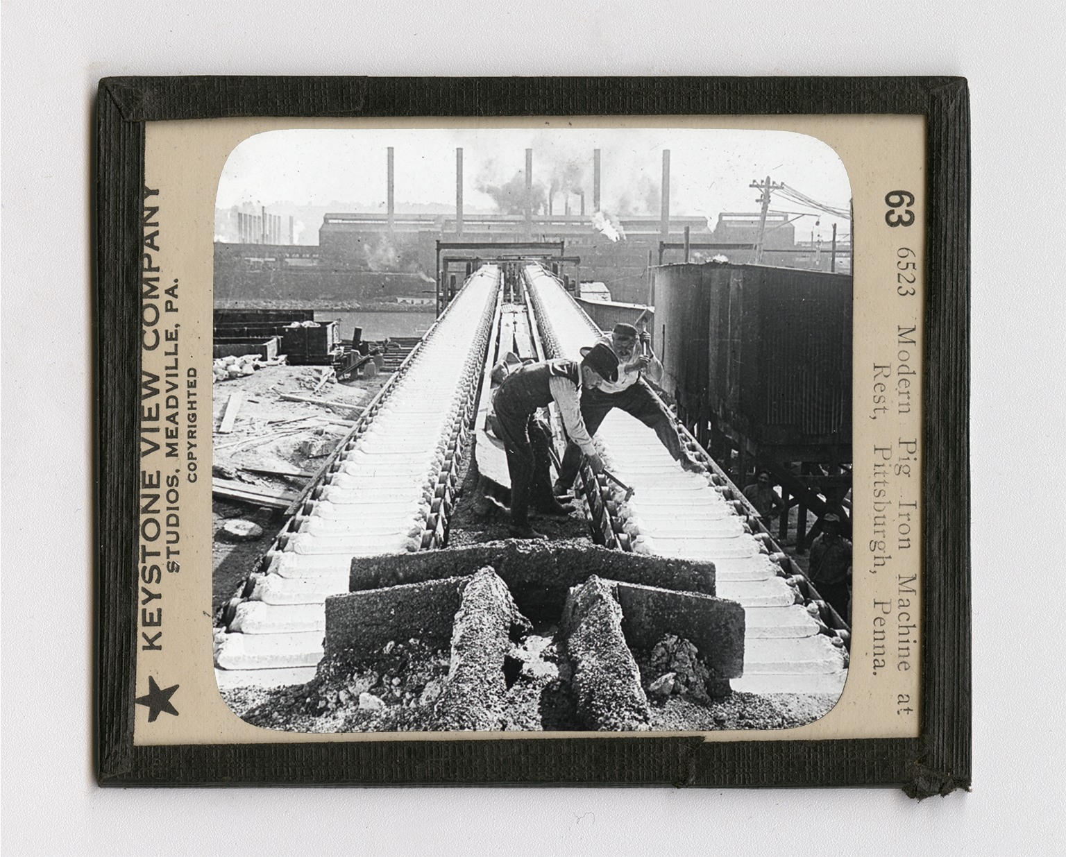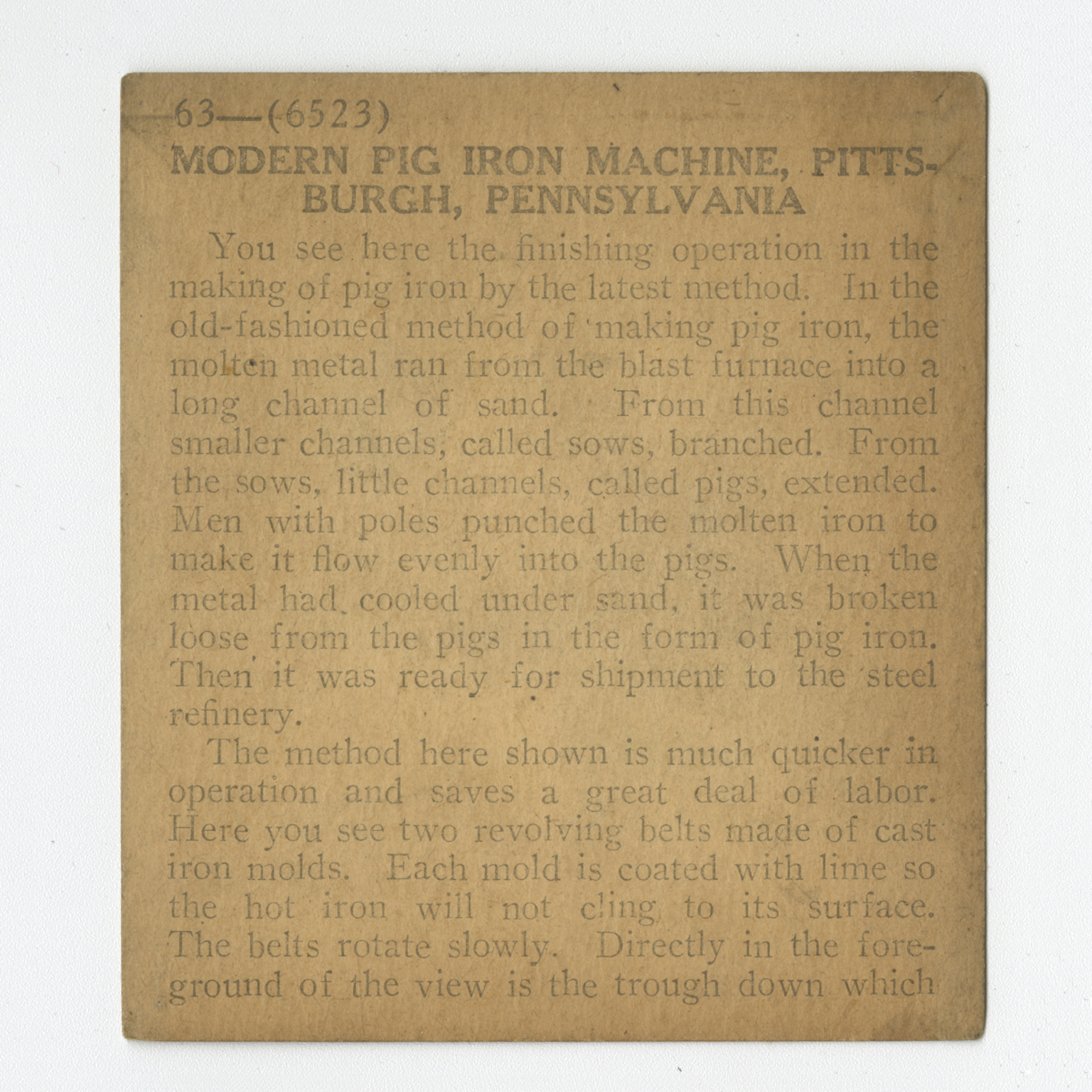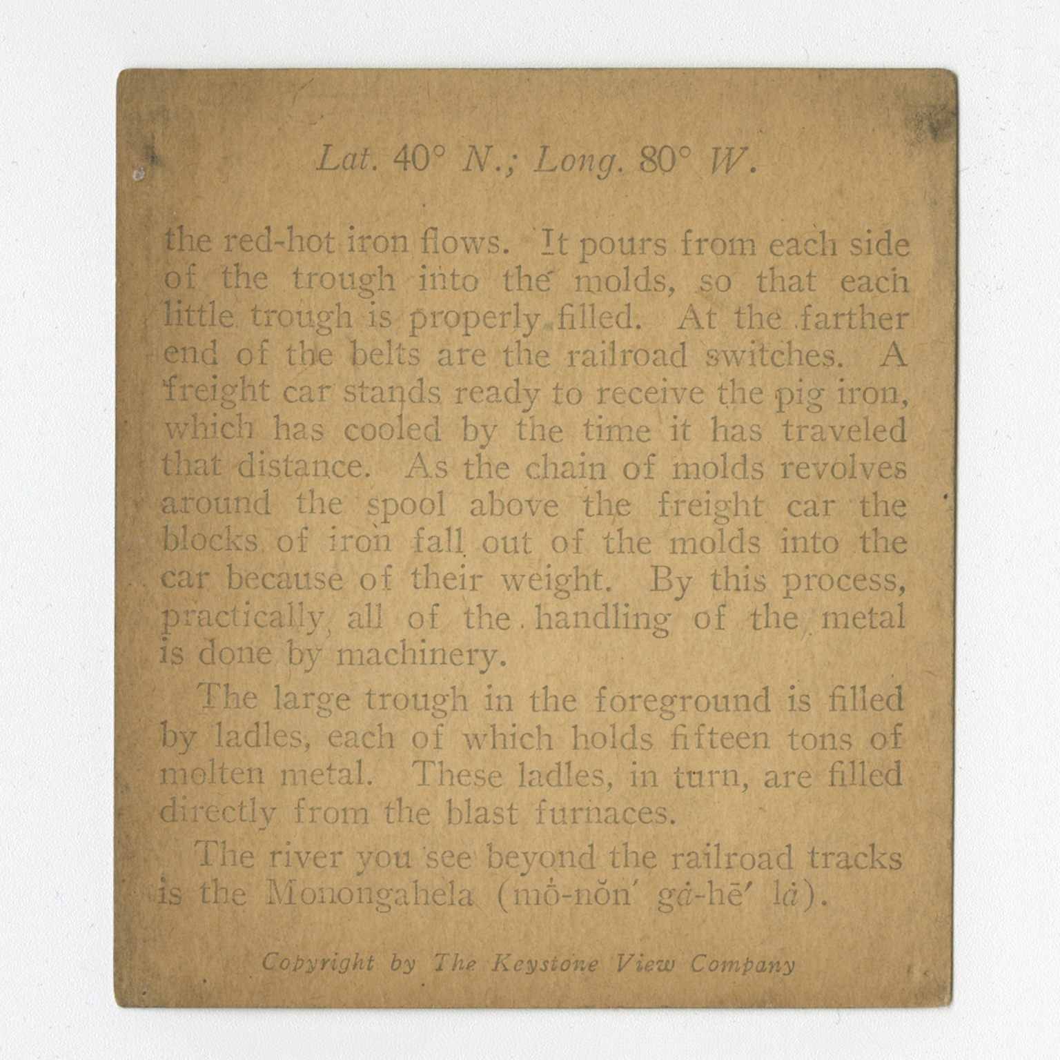 the red-hot iron flows. It pours from each side of the trough into then molds, so that each little trough is properly filled. At the farther end of the belts are the railroad switches. A freight car stands ready to receive the pig iron, which has cooled by the time it has traveled that distance. As the chain of molds revolves around the spool above the freight car the blocks of iron fall out of the molds into car because of their weight. By this process, practically, all of the handling of the metal is done by machinery. The large trough in the foreground is filled by ladles, each of which holds fifteen toons of molten metal. These ladles, in turn, are filled directly from the blast furnaces. The river you see beyond the railroad track is the Monongahela.